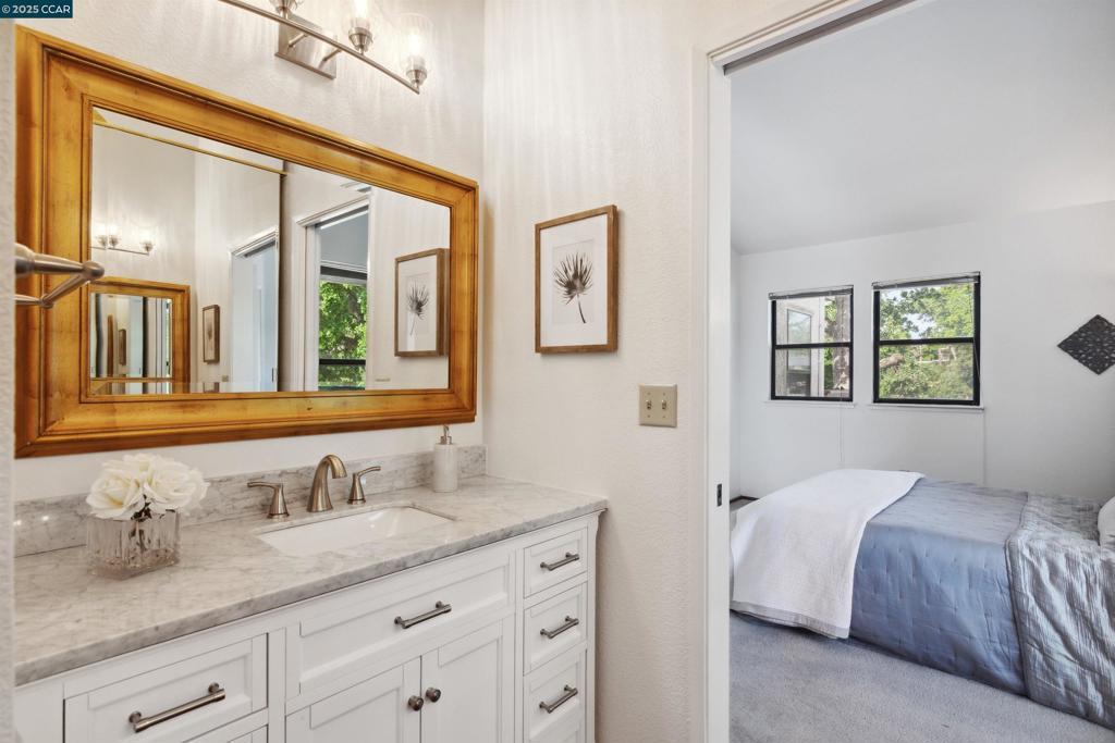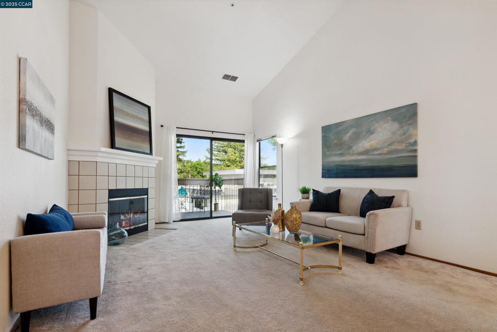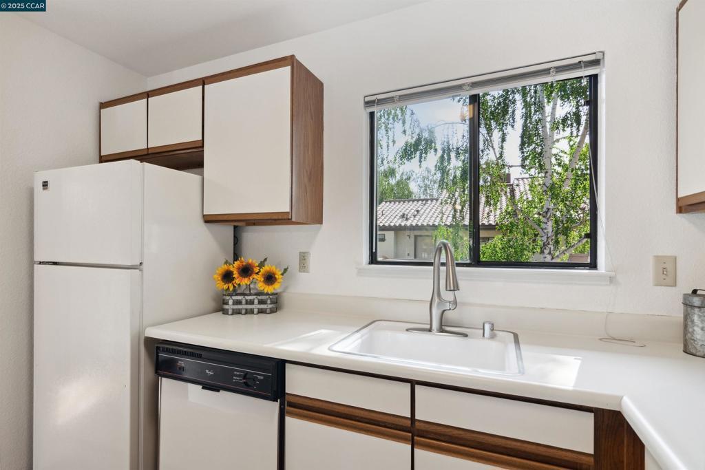Location, Location, Location! This unit boasts one of the best locations in the entire community. Backing up to the creek & trail, this unit is surrounded by birdsong, trees & sky offering serenity & privacy that is unmatched. This charming upper-level condo is nestled in the popular Villas Community in Walnut Creek offering a bright & open floor plan & comes w/ new laminate flooring, freshly painted interior, updated bathroom, wood burning, fireplace, in unit washer & dryer & a private shady patio. As you enter the home you will be delighted w/ the vaulted ceilings & how the entire space is filled w/ abundant natural light. The kitchen offers new lighting, a versatile breakfast bar w/ generous counter space & cabinets & includes built-in microwave, refrigerator, oven, stove & dishwasher making cooking & entertaining a delight. Open kitchen overlooks the bright & cheery dining room w/ modern chandelier & into the spacious living room w/ vaulted ceilings & tiled fireplace giving the room a warm & inviting feeling. Sliding glass doors lead out to the private patio radiating a tree house style setting of nature & birdsong. The bedroom is airy and bright w/ windows on 2 sides of this rare corner unit, updated full bathroom includes new vanity. Stacked washer/dryer in entry closet.