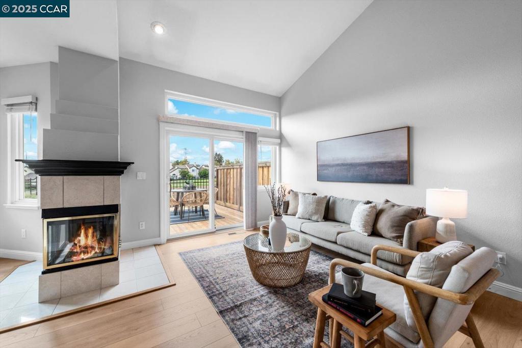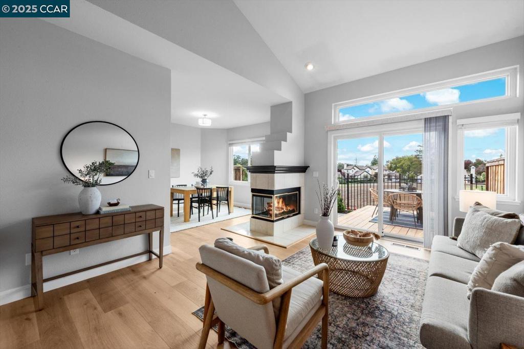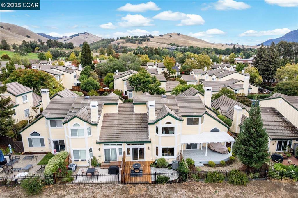 A charming two-story townhouse in Clayton’s sought-after Chaparral Springs. With 3 beds, 2.5 baths and 1,367 sq ft, it’s designed for easy living. Enjoy a tranquil setting just minutes from Oakhurst Country Club, scenic trails and downtown Clayton. A marble-tiled entry opens to a bright living and dining area where sunlight and a two-way marble-tiled fireplace create inviting warmth. Sleek, high-quality laminate flooring connects the spaces and a sliding door leads to a low-maintenance yard with redwood decking, a retractable Sunsetter awning, and a stone patio overlooking the Oakhurst golf course and Mt. Diablo State Park for sunsets. The kitchen offers tiled floors, updated appliances, and a breakfast bar, with laundry and a half bath nearby. Upstairs, high-quality durable carpet spans an airy mezzanine landing. The primary suite features diamond-peaked vaulted ceilings, a mirrored closet, and an ensuite with dual vanities, while two additional bedrooms share a hall bath. The attached garage includes built-in shelving, a workbench, and loft storage. Recent updates include a premium HVAC system, water heater, and Andersen thermally protected west-facing windows. Chaparral Springs residents enjoy a pool, greenbelts and maintenance. Close to downtown restaurants, shops, and trails