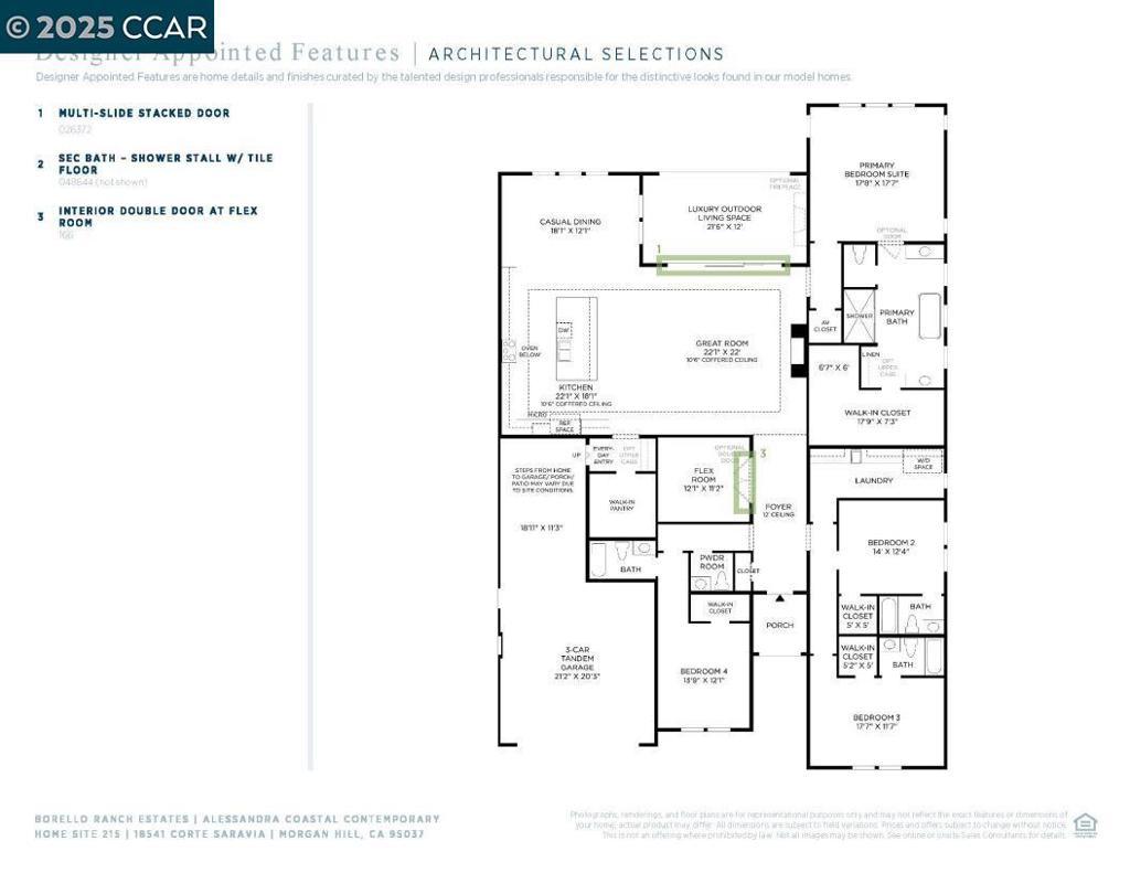 Set in a secluded location surrounded by Morgan Hill's soft rolling hills and open space, Borello Ranch Estates is a luxury gated community. Located at the southern tip of the Silicon Valley in Morgan Hill, an abundance of parks, golf courses, walking/biking trails, recreation centers and easy access to freeway and public transportations. An expansive great room is at the heart of this home. The home’s welcoming foyer opens onto the expansive great room with coffered ceiling, and multi-slide stacked door leads to desirable luxury outdoor living space beyond. Gourmet kitchen is open to a sizable casual dining area and features a large center island with breakfast bar, wraparound counter, white shaker style modern cabinets, and upgraded JennAir stainless steel appliances. Secluded primary bedroom suite are a generous walk-in closet and gorgeous primary bath with dual vanities, large soaking tub, luxe shower, linen storage, and private water closet. Secondary bedrooms feature roomy closets and private baths. Additional highlight include a large flex room with double French doors. Enjoy the 7,000+sqft resort-style recreation center with impressive pool, spa, barbecue facilities, bocce ball/pickleball courts and many other amenities (Photo not of actual home/yard for marketing only)