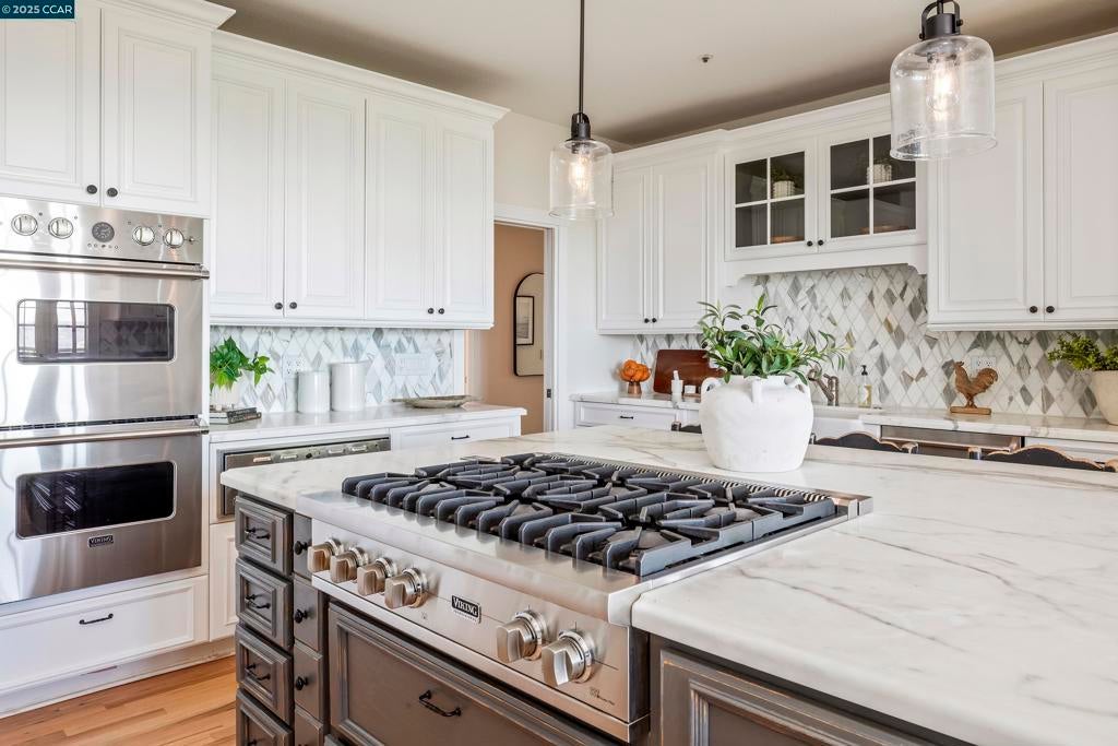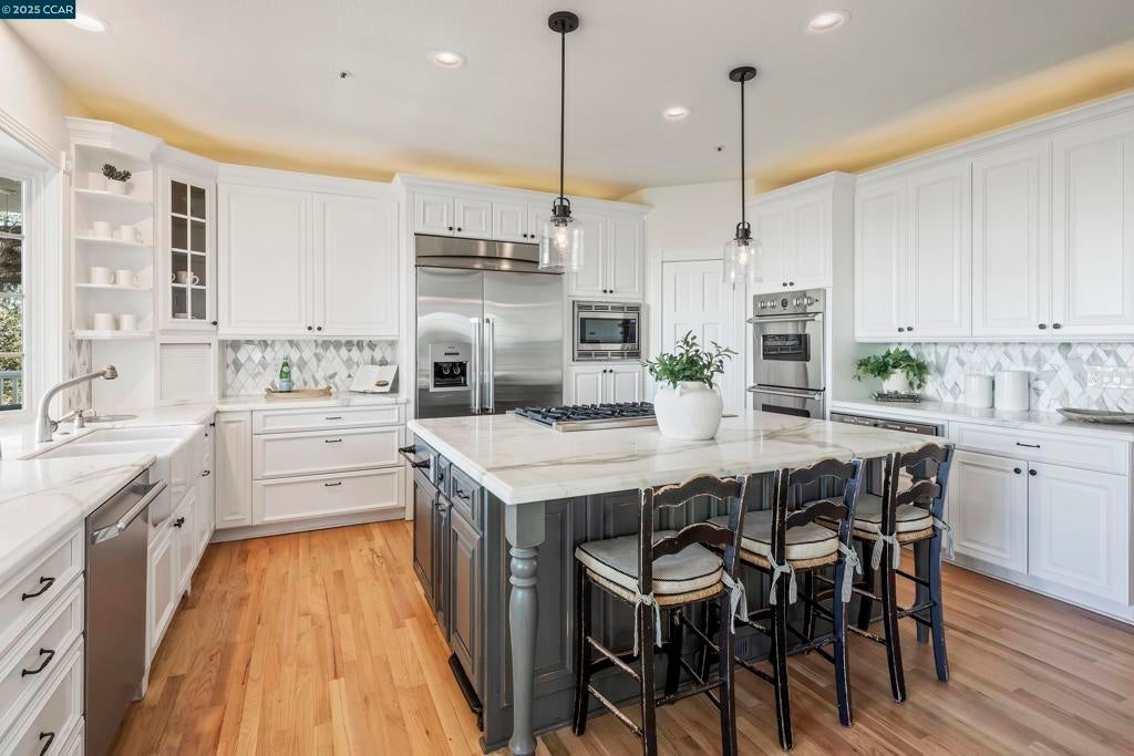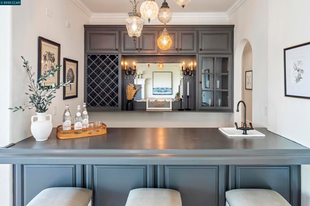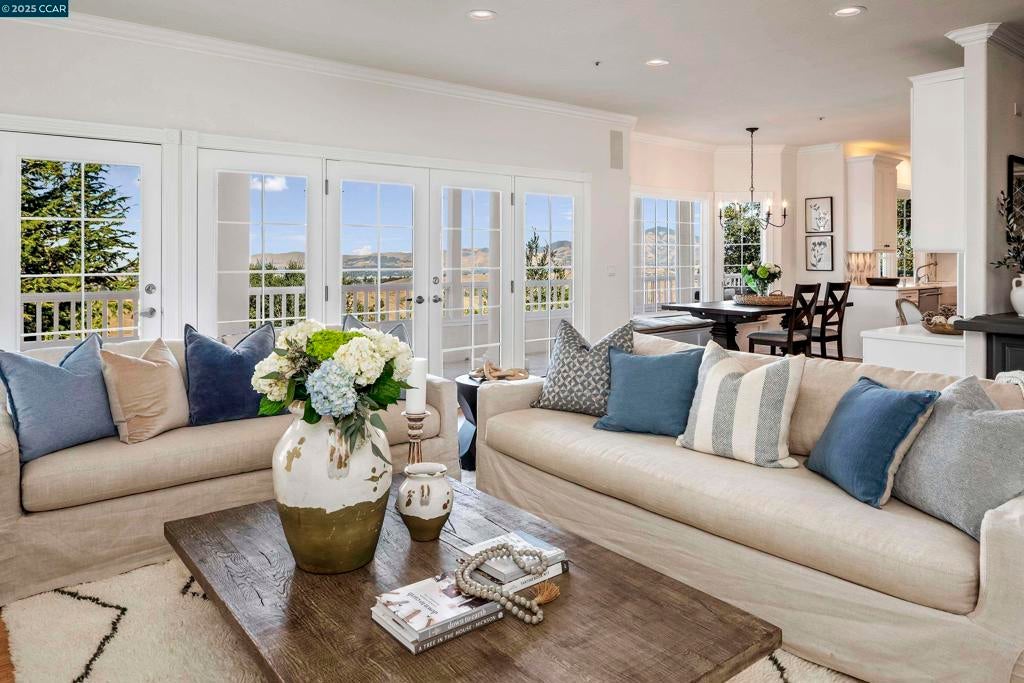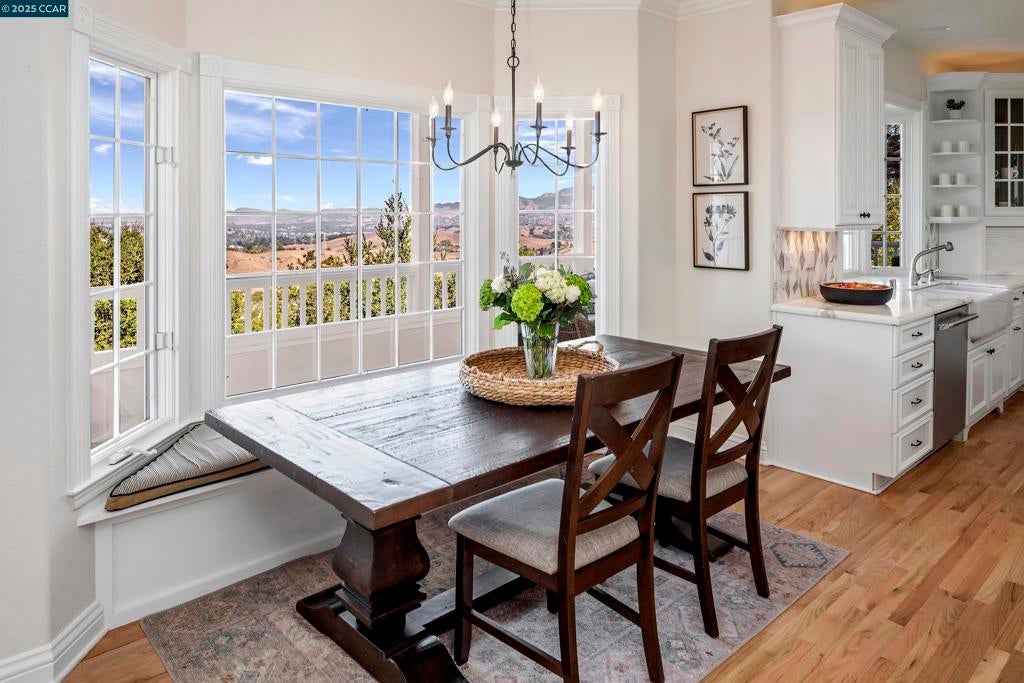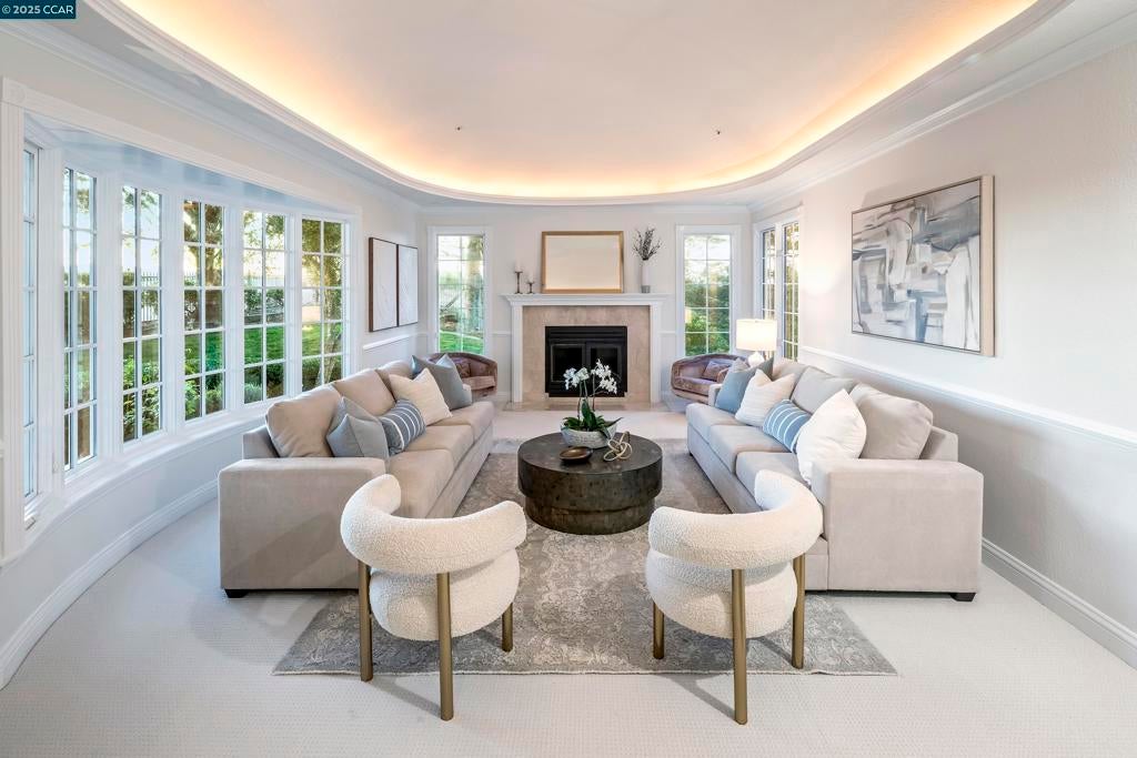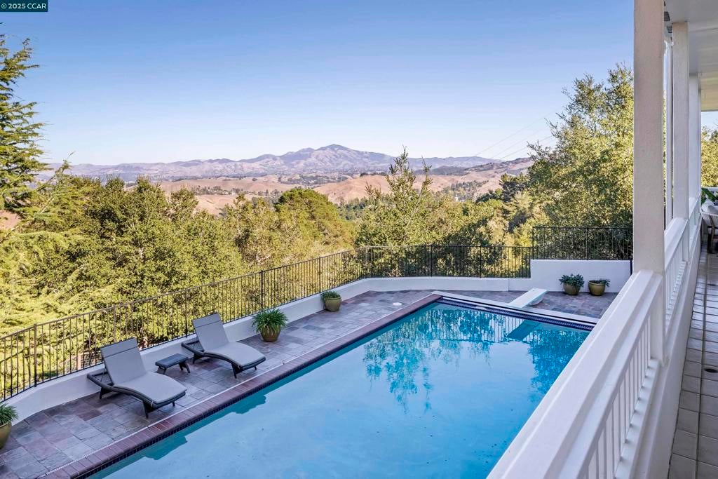 Perched atop the Orinda Oaks Open Space Preserve, this estate offers sweeping views of Mt. Diablo and the Berkeley hills. Mature oaks, Japanese maples, wisteria, lavender, roses, and other lush foliage flank the home. Step inside the foyer beneath 15-foot ceilings. To the left, a 360-sq-ft living room sits under a coffered ceiling; to the right, the dining room accommodates 10-12 with garden views. The kitchen features a large island with bar seating, a breakfast nook nestled into a bay window, 2 ovens, 2 sinks, 2 dishwashers, and ample counter space. Adjoining the kitchen, the family room spans more than 360 sq ft and includes a full wet bar. A 240-sq-ft office and large wraparound patio offer inspiring views—including glimpses of SF Bay. Four bedrooms are on the lower level, including a private guest/in-law suite or exercise room. The 460-sq-ft principal suite upstairs offers a marble fireplace, 2 walk-in closets, a nursery or exercise room, and a luxurious bath with steam shower, jacuzzi tub, sauna, dual vanities, and skylights. Outdoor living is equally distinguished with a covered swimming pool, built-in grill, and pergola-shaded lounge area with a new gas firepit overlooking the Preserve’s natural splendor.