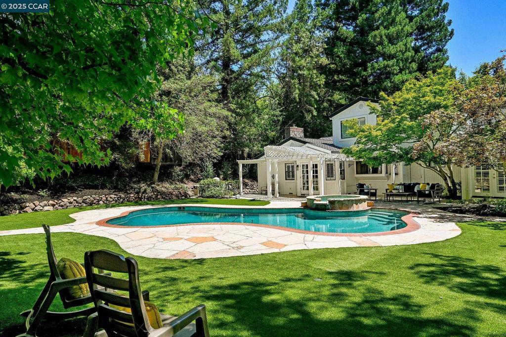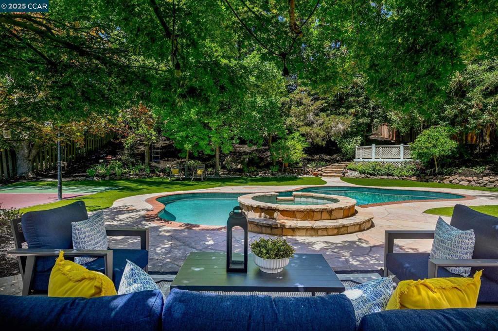 Tucked behind the gates of the coveted Hidden Oaks community, this timeless estate blends classic design with resort-style living **a fabulous opportunity at an incredible price**. Soaring vaulted ceilings and an abundance of natural light create a warm and inviting ambiance throughout. The thoughtfully designed floor plan features a main-level primary suite with French doors opening to the backyard, a luxurious spa-inspired bath with soaking tub and shower, walk-in closet with custom built-ins, and a private laundry area. A secondary downstairs bedroom—currently used as an executive office—includes a built-in Murphy bed and easy access to the guest bath, offering exceptional flexibility for guests or remote work. Upstairs, three additional bedrooms include one with an en-suite bath, plus a full hall bath and dedicated laundry room. Step outside to your private oasis with a resort-style pool and spa, sport court, and lush grounds designed for effortless indoor-outdoor living. The expansive backyard also offers space for a potential pool house or ADU, adding even more value and versatility.