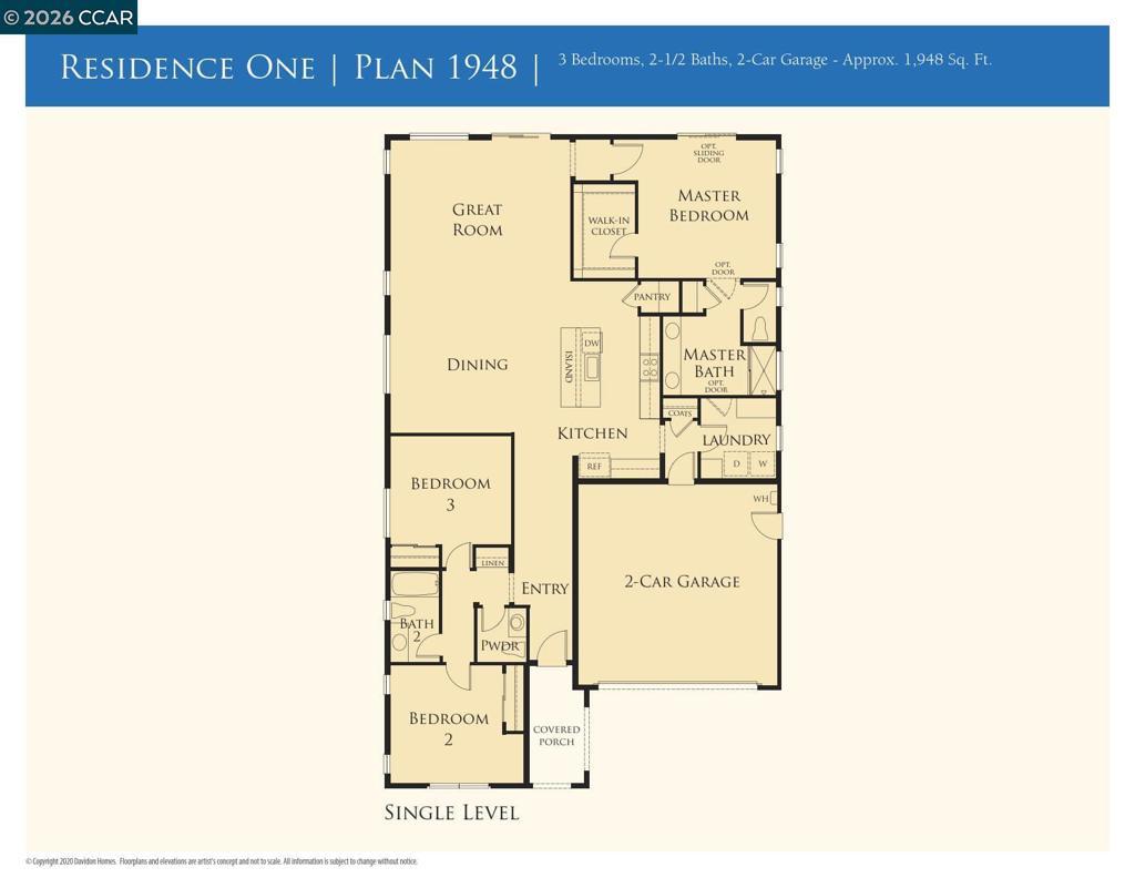QUICK CLOSE OF ESCROW AND BROKER COMMISSION on this BRAND-NEW SINGLE-STORY home at The Hills at Park Ridge by Davidon Homes! Featuring Brentwood Schools, this beautiful Residence One encompasses three bedrooms and two and one-half baths in approximately 1,948 sq. ft. The open and inviting great room includes stylish and durable LVP flooring, sliding doors to the rear yard, dining area, and gourmet kitchen with Whirlpool appliances, quartz countertops, marble backsplash, recessed panel wood cabinetry, walk-in pantry, and expansive casual dining/prep island. An elegant primary suite features a spacious walk-in closet and beautifully appointed bath with double vanity and glass enclosed shower. Located just minutes from BART and Hwy 4 in the Brentwood Union School District, this incredible home offers affordable luxury in one of Antioch’s most commuter-friendly locations. Residents enjoy close proximity to shopping, dining, parks and recreation, and the popular Streets of Brentwood. Includes over $25K in designer upgrades and builder options! ASK ABOUT OUR SPECIAL FINANCING INCENTIVES!