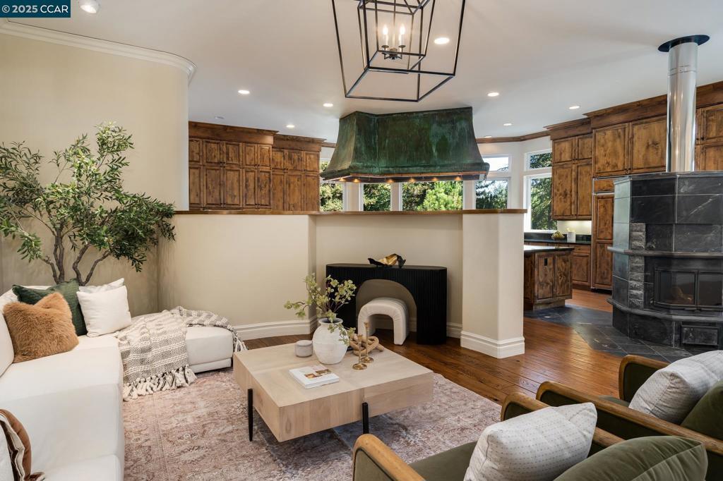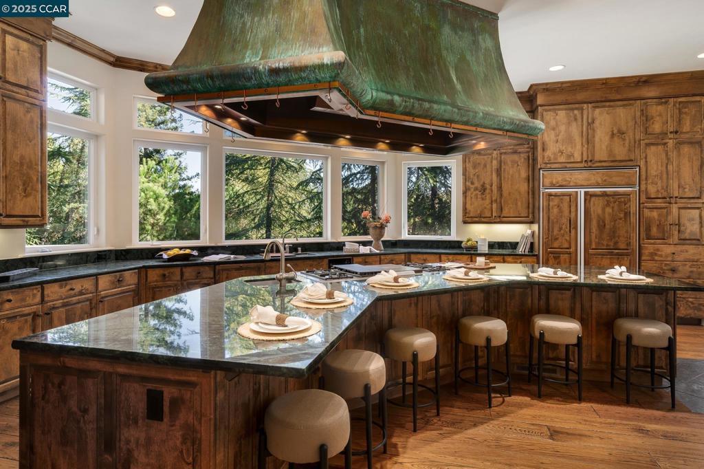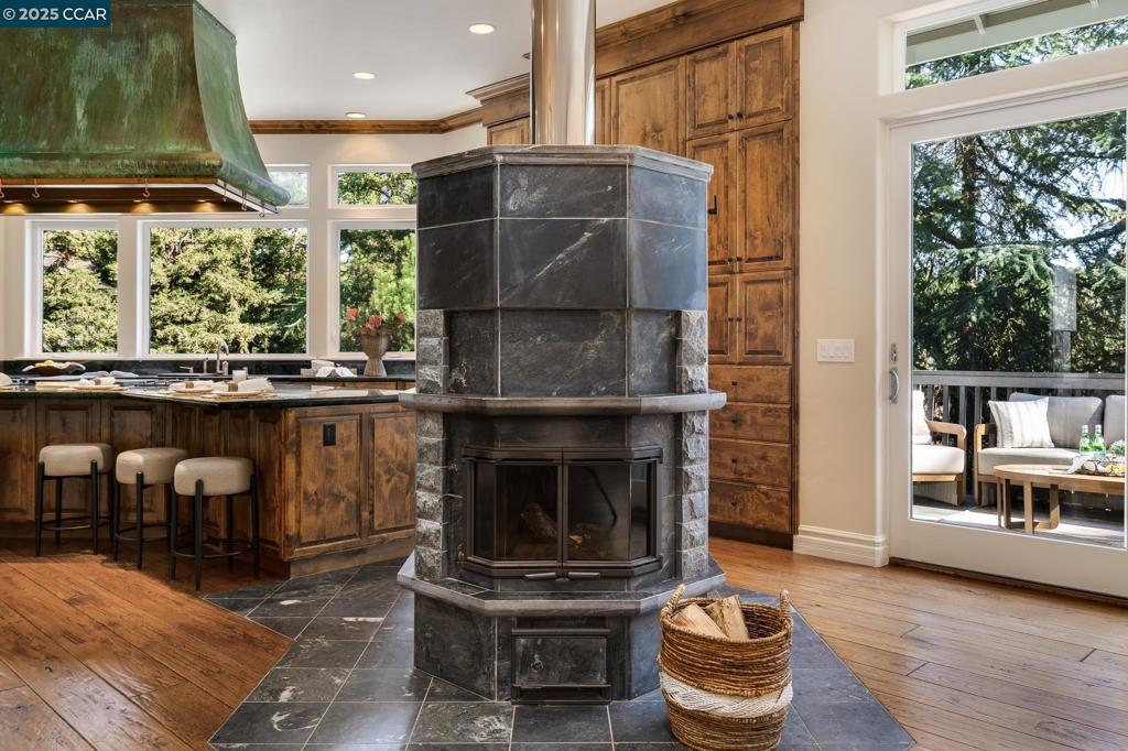 This stunning custom residence, built by renowned R&J Construction, rests on nearly half an acre surrounded by lush, mature landscaping. Designed for both entertaining and everyday living, the open-concept layout blends timeless craftsmanship with modern comfort. Originally owned by Franklin “Pete” Kistner—founder of the restaurant Pete’s Brass Rail & Car Wash—this home radiates warmth, character, and enduring charm. At the heart of the home, the chef’s kitchen captivates with a patinated copper vent hood as its centerpiece, complemented by rich custom cabinetry, striking green marble countertops, and a professional-grade Lacanche range featuring three ovens and two warming drawers. Perfect for gatherings, the oversized island with prep sink seats six. Built-in stainless steel appliances include double ovens, refrigerator, and dishwasher. A stone fireplace with integrated pizza oven anchors the open living and dining areas, leading to a spacious deck ideal for entertaining or quiet relaxation among the trees. The luxurious primary retreat offers deck access, a spa-inspired bath, and generous walk-in closet. The main level includes two additional bedrooms—one used as an office—and laundry room, while the upper level features a private bonus room or potential fourth bedroom.