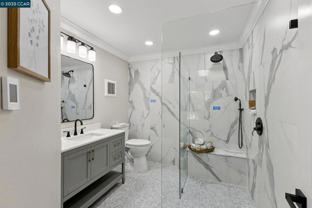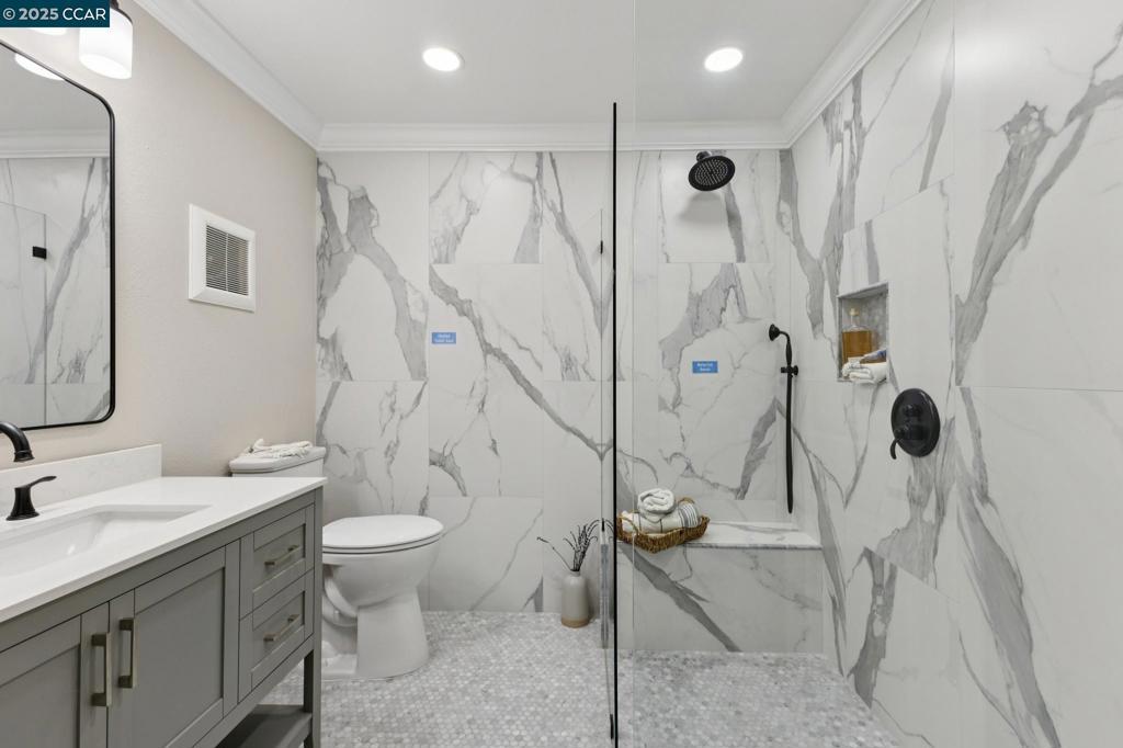 The Walke Inn is a beautifully reimagined, fully renovated home designed for both elegance and comfort in the heart of Rossmoor’s 55+ community. Expertly updated by Fred Rooster Renovations, this Sonoma model features thoughtful design and modern touches throughout. At the heart of the home is an inviting open concept kitchen with a large island with seating, oversized farmhouse sink, induction range with pot filler, quartz countertops, and a full-sized pantry closet for ample storage. Milgard dual-pane windows and a large rear patio door flood the space with natural light, while high-end finishes create a warm, upscale feel. The primary suite boasts an expansive layout featuring a massive walk-in closet and a luxurious en-suite bath with a retiree friendly curbless walk-in shower. A second full bathroom includes another walk-in shower with built-in seat. Additional features include in-unit full-sized laundry, a front door smart lock, and a layout ready for a minimalist lifestyle. Step outside to enjoy the huge balcony—perfect for relaxing or entertaining. From stylish finishes to smart upgrades, every detail has been considered. *** Seller is offering to pay buyers HOA fee for 6 months for any new contract before 12/25/2025 ***