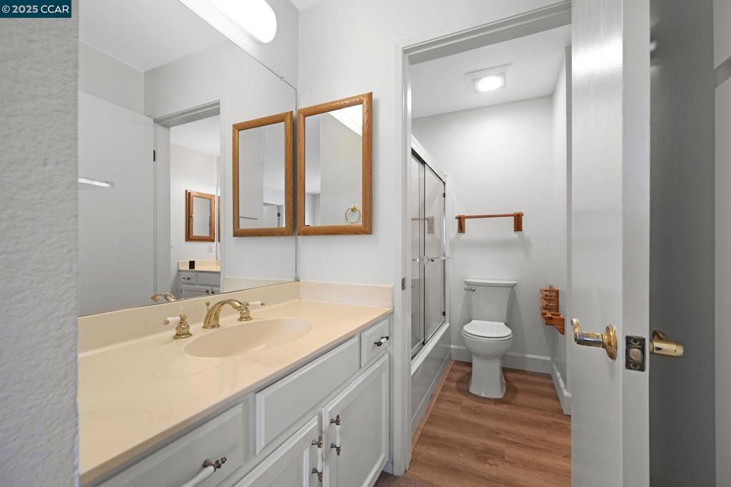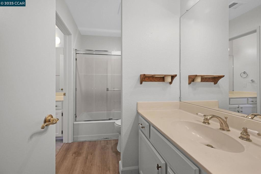 Fantastic price for a bright, move-in ready condo! Freshly painted throughout with new flooring in all rooms. Can you believe the square footage! Large, sunny, open floor plan. Wood burning fireplace in living room which opens to spacious deck framed by treetops. Bright kitchen with new dishwasher; fridge included. Half bath downstairs for convenience with additional understairs storage. Full size washer/dryer. Primary bedroom has wood shutters and a generously sized walk in closet. Jack & Jill bathroom with sinks on both the primary BR side and the hall side. Tub/shower combo with new enclosure. Another private deck outside the 2nd bedroom upstairs. Locking storage space in parking garage. Two covered parking spots included! Security gate, pools and excellent central location make this a wonderful choice for your new home.