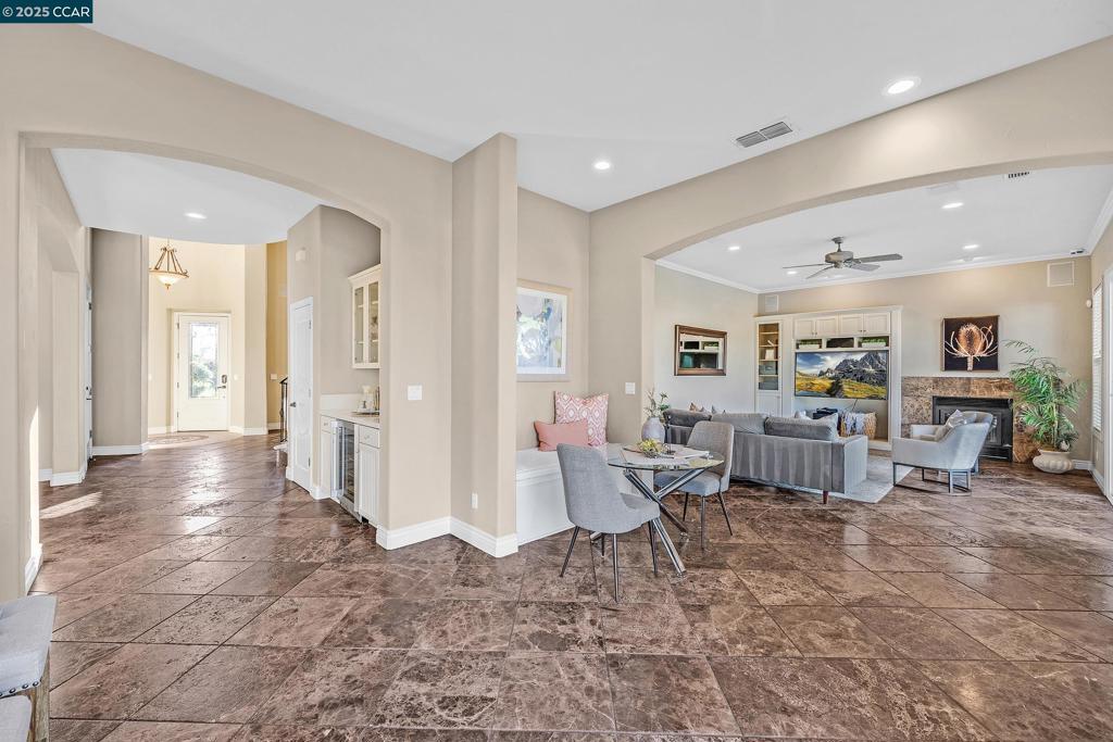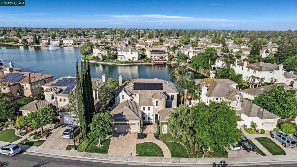 Gorgeous home in gated Brookside Country Club, backing to Spyglass Lake. Exquisite detail and finishes. 3 beds plus retreat/possible 4th bed or office (floorplan has a 4th bed/office option), 3.5 baths. Enter into a foyer w/ tile medallion, soaring ceilings. Formal living and dining rooms. Downstairs bedroom and full bath plus powder bath for guests. Kitchen open to breakfast nook, family room and backyard with stunning water views. Recently remodeled kitchen is a chefs dream with Quartz counters, island, high end stainless appliances, sleek cabinets. Wet Bar with wine refrigerator. Energy efficiency features include owned 2.5 KW solar system, Tesla charger,Tankless Water Heater, upgraded R-49 Attic Insulation. Large Balcony overlooking the lake from primary bedroom suite. Primary bath remodel includes soaking tub and walk in oversized marble shower. Built-in outdoor BBQ/gas burner for Al Fresco dining. Large backyard with stunning water view with steps leading down to a private boat dock. Finished 3 car tandem Garage with custom cabinets and Epoxy floors. Upgraded tile floors throughout, custom light fixtures, detailed tilework, hand plastered walls, fountain, TV's in every room and lots more upgrades. Move-in ready. Nothing like this in Brookside CC. Beauty meets functionality!