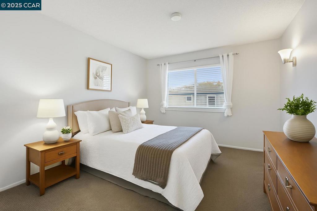 Discover comfortable living in Concord’s sought-after Del Rio Court community. This inviting two-story condo offers approx. 877 sq. ft. of well-designed space, featuring 2 bedrooms and 1.5 baths. The main level includes a bright living area and an updated kitchen with solid-surface counters, modern cabinetry, a stainless dishwasher, and direct access to the attached garage where the laundry is located — a rare convenience in condo living. Fresh carpeting, dual-pane vinyl windows, and tasteful updates throughout add to the home’s appeal. Upstairs, both bedrooms offer generous proportions and calming, neutral finishes, creating ideal spaces for rest and relaxation. Parking is effortless with an attached garage plus an additional tandem space. Residents enjoy access to the community pool and beautifully maintained greenbelt areas, while HOA dues cover water and trash for added convenience. With close proximity to shopping centers, restaurants, schools, parks, and major commute routes, this move-in-ready home delivers an easy, convenient lifestyle in a central Concord location.