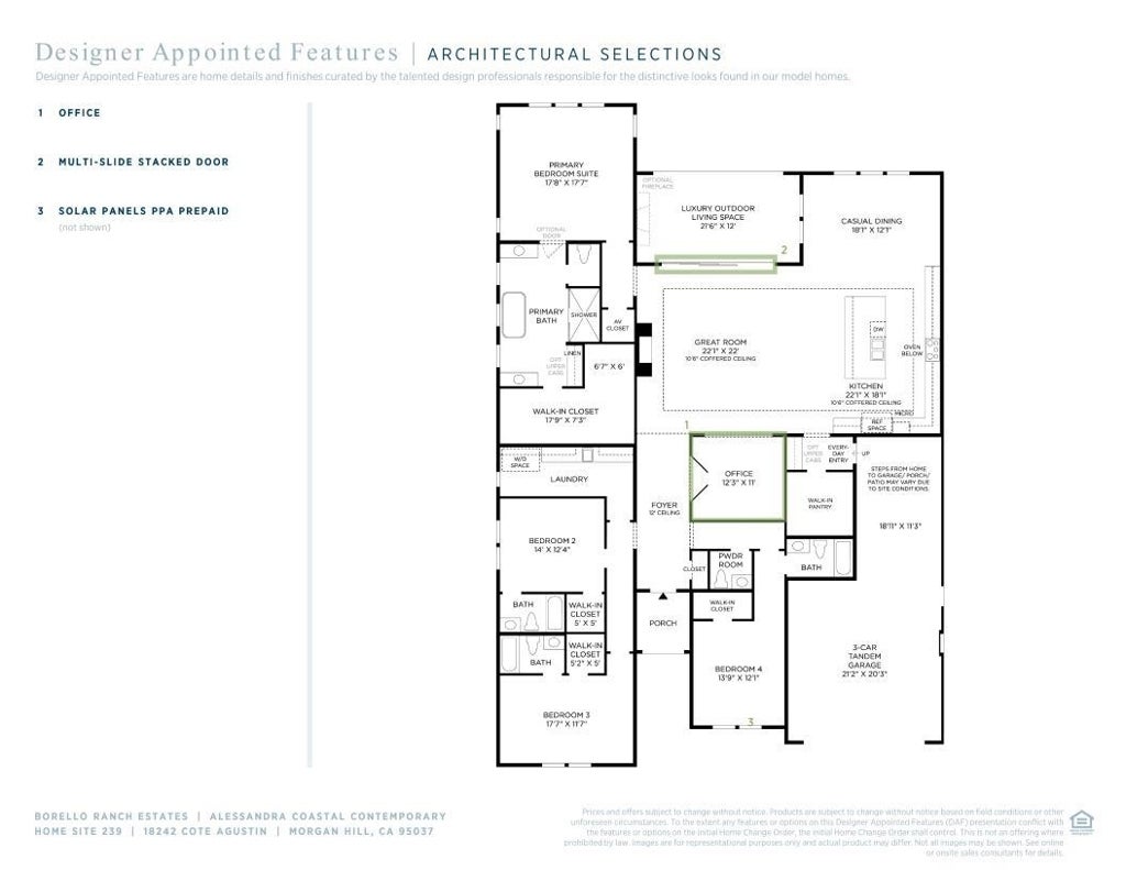 Set in a secluded location surrounded by Morgan Hill's soft rolling hills and open space, Borello Ranch Estates is a luxury gated community. Located at the southern tip of the Silicon Valley in Morgan Hill, an abundance of parks, golf courses, walking/biking trails, recreation centers and easy access to freeway and public transportations. Great room is at the heart of this home. A welcoming foyer opens onto the great room with coffered ceiling, multi-slide stacked door leads to desirable luxury outdoor living space. Gourmet kitchen open to a sizable casual dining area, large center island, breakfast bar, wraparound counter, modern cabinets, upgraded JennAir stainless steel appliance package. Secluded primary bedroom suite are a generous walk-in closet, gorgeous primary bath, dual vanities, large soaking tub, luxe shower, linen storage, and private water closet. Secondary bedrooms feature roomy closets and private baths. Additional highlight include a large flex room with double French doors, 3-car garage, energy saving solar panels. Enjoy the 7,000+sqft resort-style recreation center with impressive pool, spa, barbecue facilities, bocce ball/pickleball courts and many other amenities (Photo not of actual home for marketing only, same floor plan)