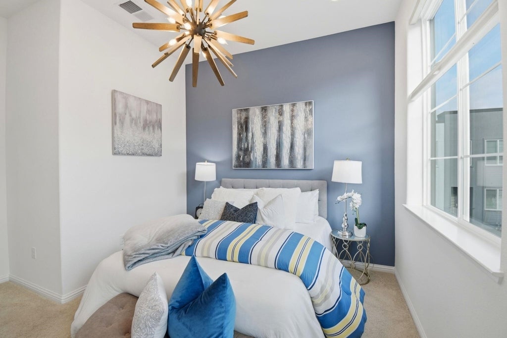 Modern luxury meets sustainable living at Lookout Bay37! Built in 2023, this turn-key residence in the heart of Alameda Landing features a rare and highly coveted 2-car side-by-side garage. The open-concept main level shines with designer LVP flooring and an upgraded lighting package. A chef’s kitchen serves as the home’s centerpiece, boasting a large island, premium cabinetry, quartz countertops, and a full-height backsplash. Custom Hunter Douglas window treatments provide elegance and privacy throughout. The thoughtful design continues upstairs with serene bedrooms featuring custom fixtures and plush carpeting. The primary suite serves as a true retreat with a professionally designed custom closet system. Notable owner-added enhancements include organized garage shelving and a fully OWNED solar system for maximum energy efficiency. Sold complete with a newer refrigerator, washer, and dryer, this home offers a seamless move-in experience. Ideally situated steps from the San Francisco Ferry, waterfront trails, and local dining, it offers the ultimate East Bay lifestyle within Alameda’s top-rated school district. Experience nearly new construction with every premium upgrade already in place. Welcome home!