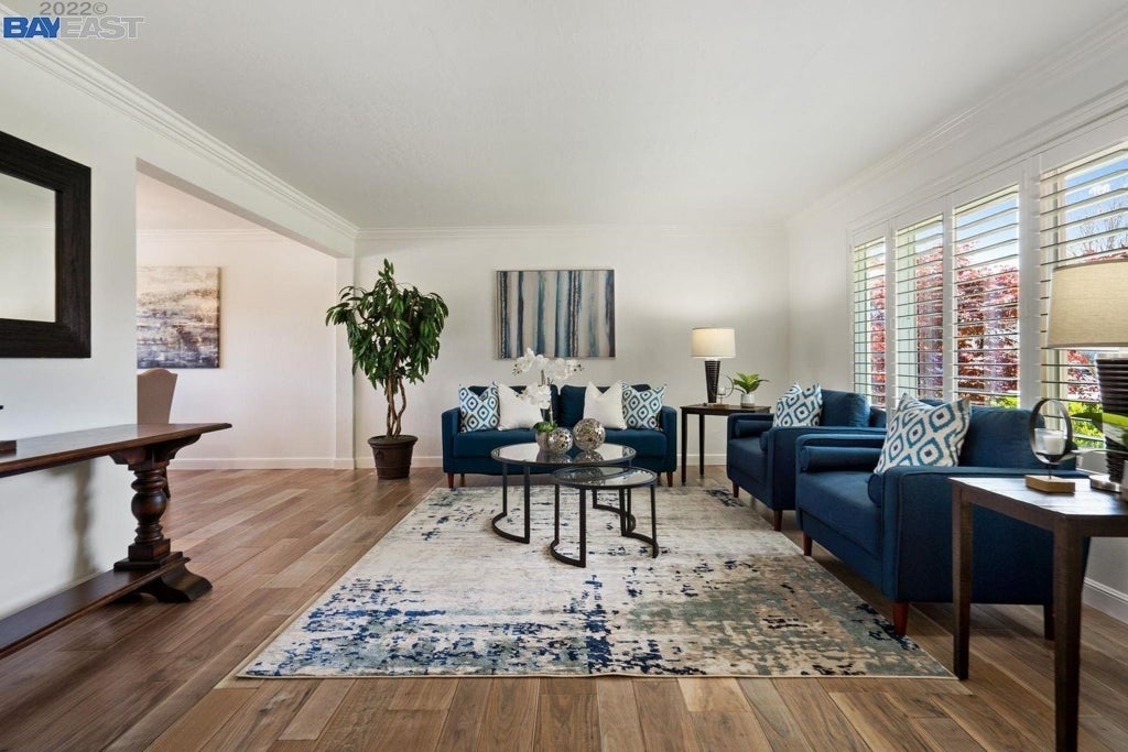 Expanded Miramar model extensively renovated throughout. Features include wide-plank hardwood floors, crown molding, fresh interior and exterior paint, recessed LED lighting, and dual-pane windows with plantation shutters. Updated quartz kitchen with stainless steel appliances including gas range, built-in microwave, refrigerator, and large pantry. Formal dining room, spacious living room, and family room with gas fireplace, built-ins, and custom tile surround. Updated half bath and indoor laundry with Whirlpool washer and dryer. Upstairs offers four bedrooms plus bonus loft/optional fifth bedroom. Primary suite includes dual-vanity granite bath, tile shower, and oversized walk-in closet with organizers. Three additional large bedrooms and two updated granite baths with newer fixtures. Entertainer’s backyard with stamped concrete patio, arbor, and PebbleTec pool and spa with Acapulco shelf. Side-yard access. Walking distance to award-winning K–12 schools, parks, and Pleasanton downtown.