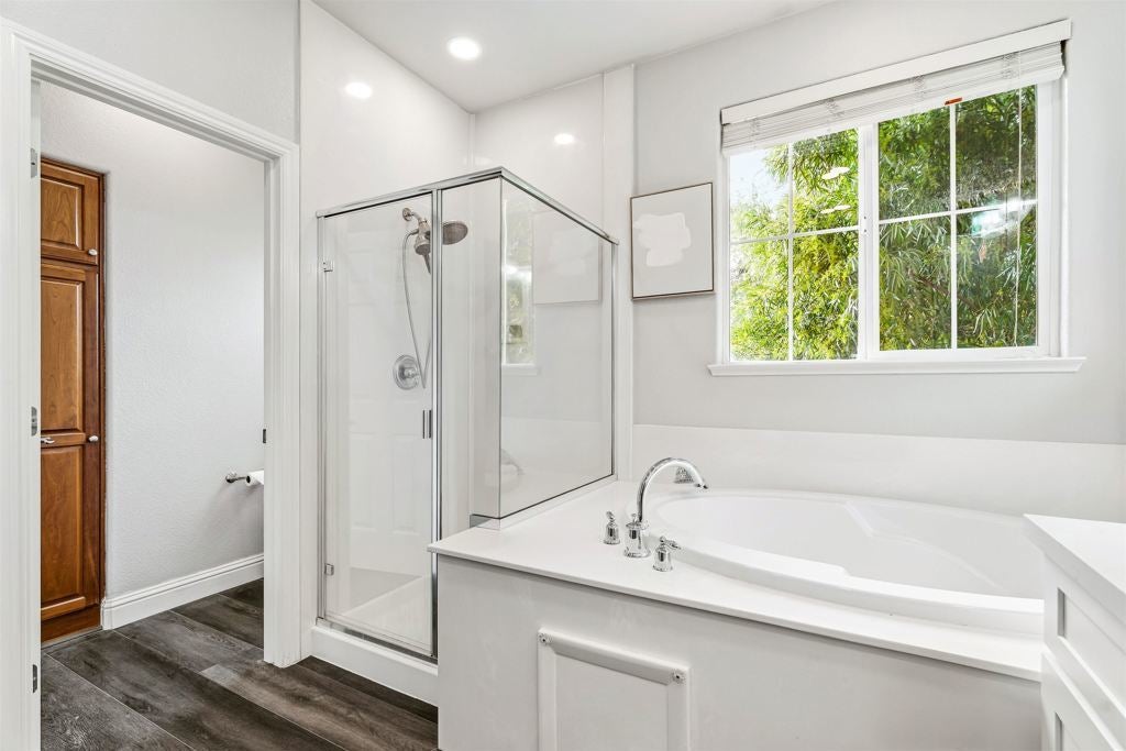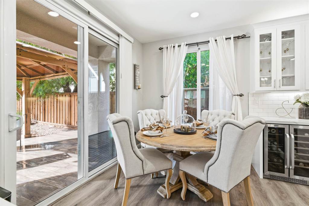 This stunning 3 BDRM, 2.5 BA, 2- car attached garage shows like a model home with 1,552 sq ft of well-designed living space. Step inside the bright & inviting open floor plan, freshly updated for today’s modern living. The gorgeous kitchen is a Chef’s delight, boasting Quartz counter tops with custom tile back splash, newer wood cabinetry with the added touch of under mount lighting & above cabinet lighting, top of the line stainless appliances including a built-in wine cooler & pantry closet. The Island has an apron style sink with bar seating providing a seamless flow to the spacious living & dining room, the upgraded Luxury Vinyl flooring is perfect for large gatherings. The upper level has 3 generously sized bedrooms, which includes the primary bedroom suite. Every room reflects pride of ownership & features stylish finishes including ceiling LED lighting, custom light fixtures, lighted bathroom mirrors. A spacious fenced backyard, tile patio w a wood Gazebo, lush lawn area with colorful plants & fruit trees perfect for outdoor enjoyment!