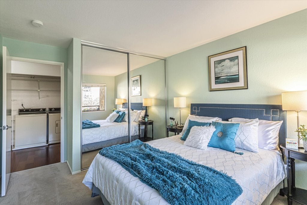 Move right in corner unit with beautiful fountain view. Nothing to do here! Welcome to this adorable condo perfectly located in downtown Fremont, near BART station and Central Park! This is a clean and beautifully upgraded one bedroom one bath second floor unit. The living room open to the dining area has a lovely fireplace with surrounding tile, a large windows, and a sliding glass door to the patio. The kitchen features updated cabinets, granite counters, electric cooktop, dishwasher, refrigerator & breakfast bar. Other features include laminate flooring the in living area, carpeted bedroom, in-unit laundry with washer and dryer included, and updated bathroom with tile flooring, and granite vanity counter. Enjoy the community amenities including a pool, a club house, and tennis courts. Close to Hwy 84, 680 and 880 for convenient commute to Facebook, Google, Silicon Valley, Peninsula or San Francisco. Why rent when you can own this beautiful unit and have it all?