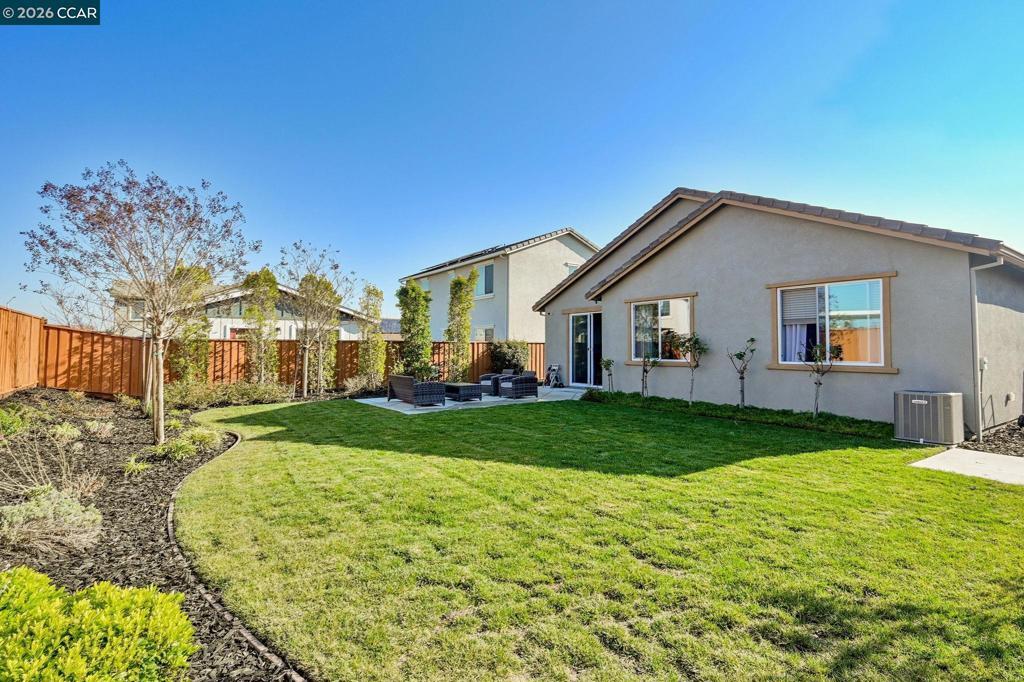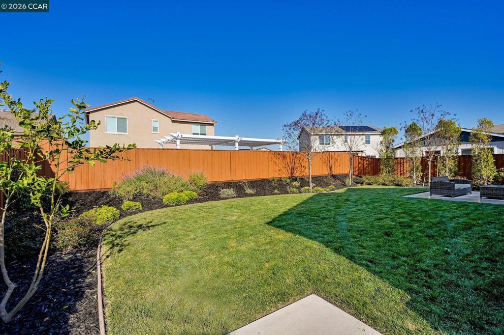 Single-story, solar-powered home on a .15-acre lot that shows like a model! Pride of ownership shines throughout this meticulously maintained home in the desirable Aviano community. The chef’s kitchen features quartz countertops, tile backsplash, designer cabinetry with LED lighting, LG stainless steel appliances, center island, pantry, and dining area—opening seamlessly to the spacious family room. Family Room has surround sound pre wiring for home theatre. The wide-open floor plan offers tall ceilings, recessed lighting, and ceiling fans throughout, with tile flooring and plush carpeted bedrooms. Enjoy the benefits of a buyer-owned 2.79-kW solar system with average monthly electric bills around $15, plus a tankless water heater and included LG washer and dryer. The spacious backyard includes a concrete patio, lush grass, and mature trees—perfect for relaxing or entertaining. Low HOA of $100/month. Residents enjoy over 25 acres of green space, parks, playgrounds, bocce ball courts, two dog parks, and walking and biking trails, with Miwok Meadows Park just blocks away. Conveniently located near Highway 4, BART, Antioch/Brentwood shopping including Costco, dining, and entertainment. Open Sunday 1/25 1-4.