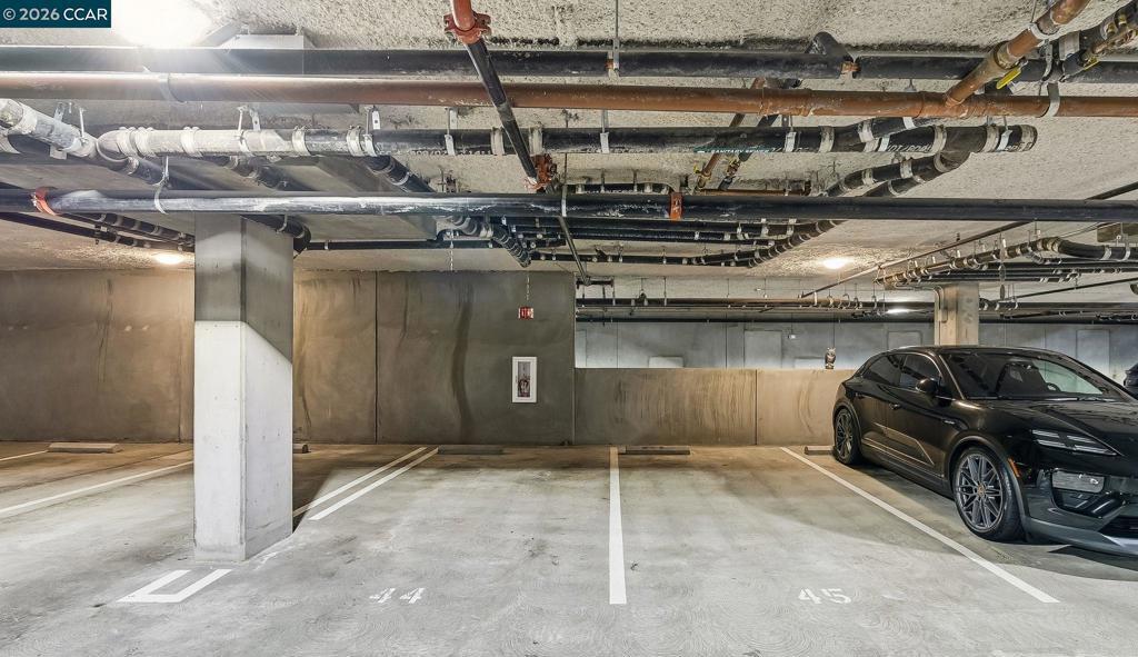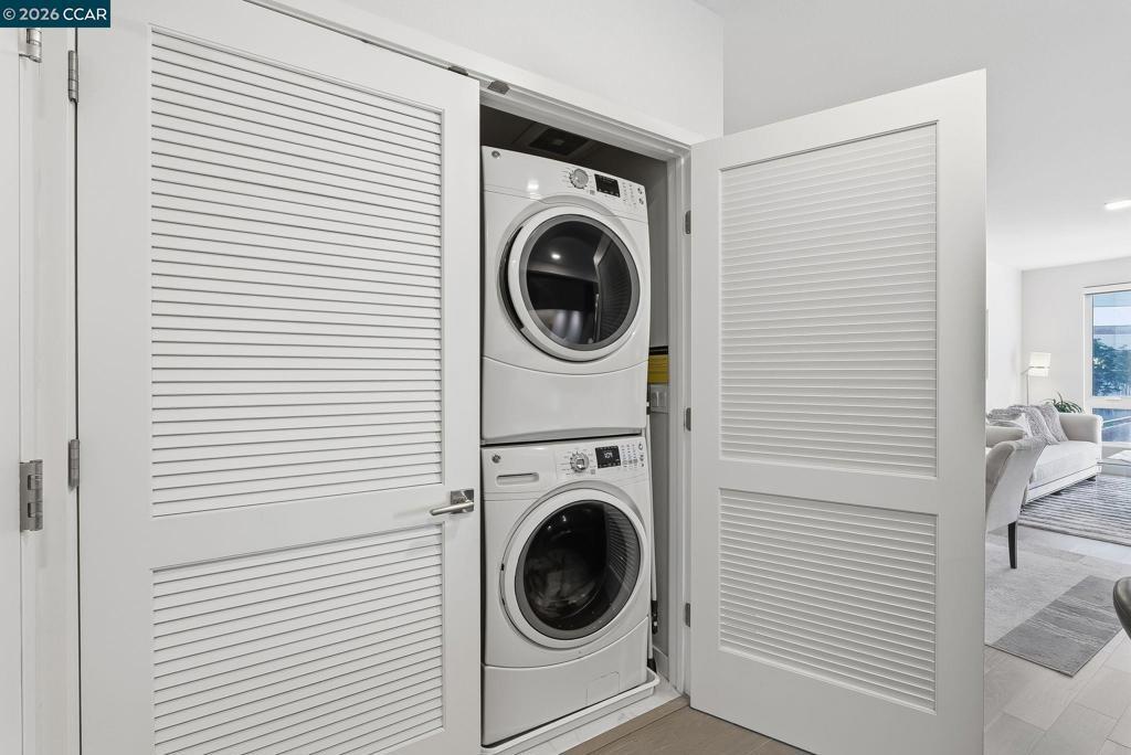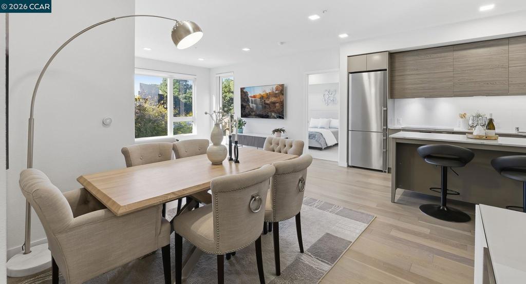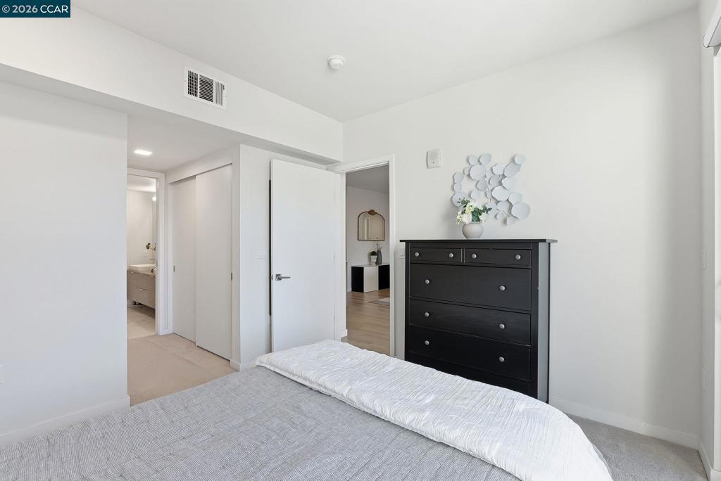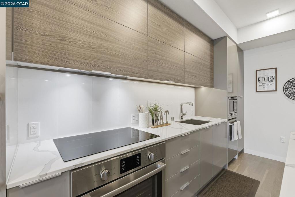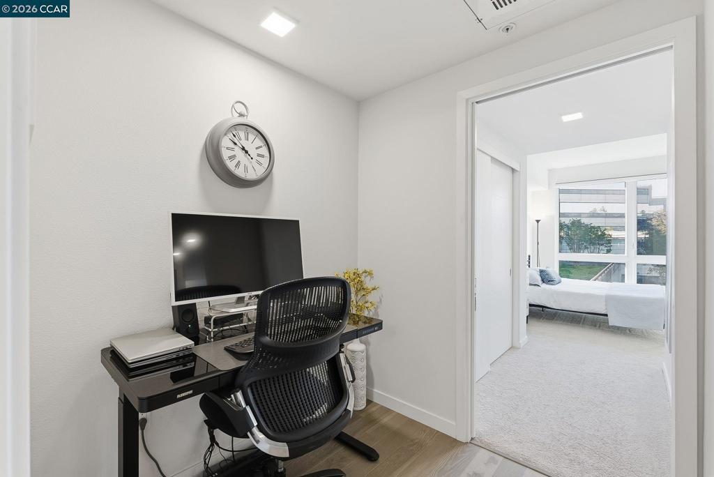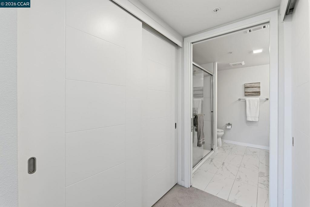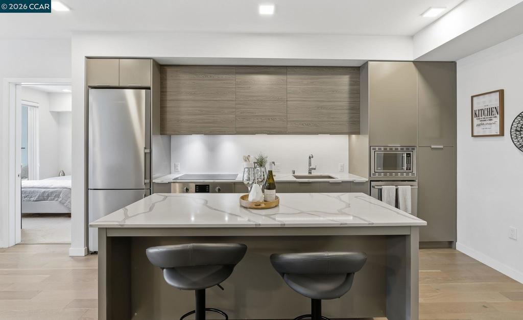 Nestled in the heart of downtown Walnut Creek, this bright and modern 1,074 sq ft, 2-bedroom, 2-bath home at The Riv offers the perfect blend of style, comfort, and convenience. With contemporary finishes and a thoughtful open layout, it’s designed for easy living in one of Walnut Creek’s most desirable locations. Step inside to soaring floor-to-ceiling windows, hardwood flooring, and abundant natural light that fills every corner. The European-inspired kitchen features sleek cabinetry, quartz countertops, a spacious island, and stainless-steel appliances—seamlessly connecting to the open living area and south-facing balcony with peaceful, tree-lined views. The primary suite offers balcony access, generous closet space, and a beautifully updated bath, while a convenient office nook sits just outside the secondary bedroom—ideal for remote work or study. Additional highlights include two deeded garage spaces, an extra storage unit, an in-unit laundry closet, and access to exceptional community amenities such as a rooftop deck with BBQ, garden patio with firepit, and a modern work lounge. With shopping, dining, BART, and freeway access just steps away, this home combines luxury, location, and lifestyle—modern downtown living at its finest.