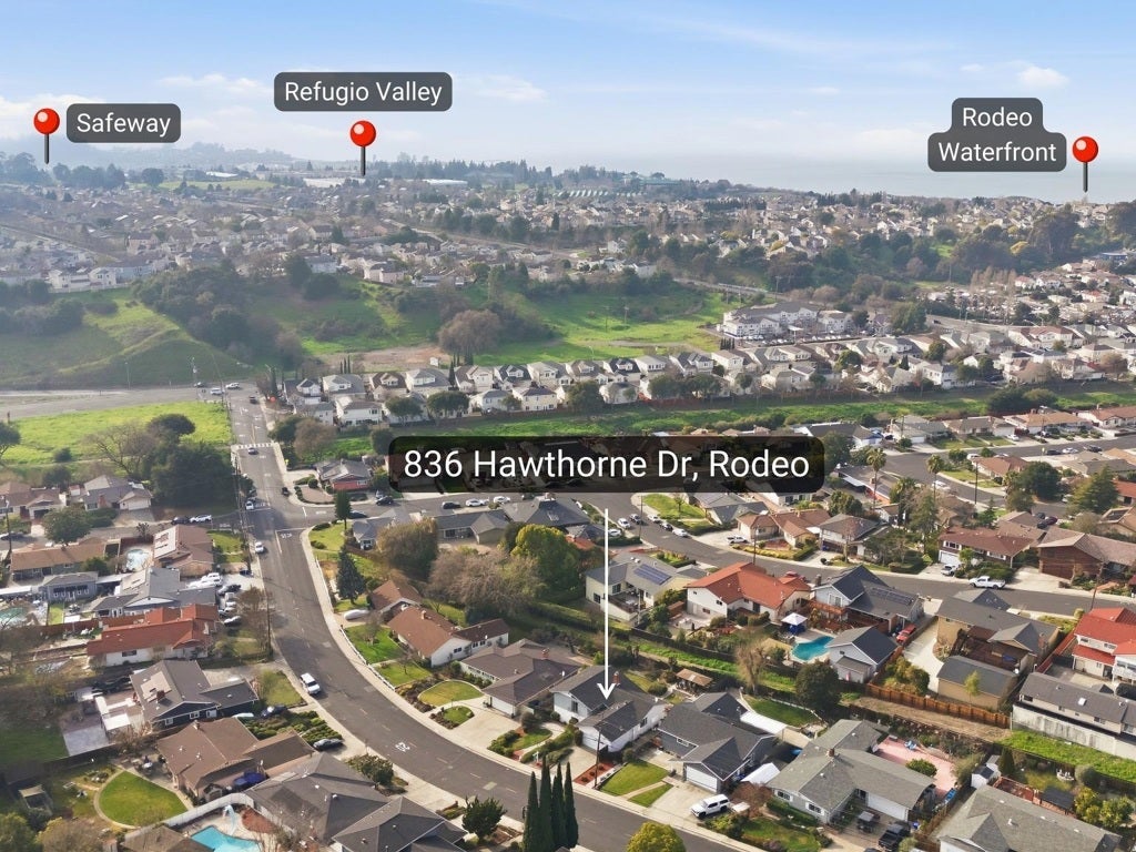 Step into this well-kept Rodeo classic where original character meets vintage charm and everyday comfort. This split-level home features a bright main living space with a vaulted ceiling, exposed wood beam, and a cozy wood-burning fireplace that creates a warm, welcoming feel. The layout flows naturally from the living and dining areas into the kitchen, breakfast nook, and family room—perfect for daily living and casual gatherings. With four well-proportioned bedrooms, the home offers a private upper-level primary suite with its own bath, while three additional bedrooms are thoughtfully located on the lower level. The backyard is flat, well maintained, and versatile, ideal for gardening, entertaining, or relaxing outdoors. An attached garage and wide driveway add convenience. Located near schools, parks, and shopping, with easy freeway access and close proximity to Hercules, El Cerrito BART, San Francisco, and the greater Bay Area, 836 Hawthorne presents a rare opportunity to enjoy vintage style, solid condition, and long-term potential in a commuter-friendly location.