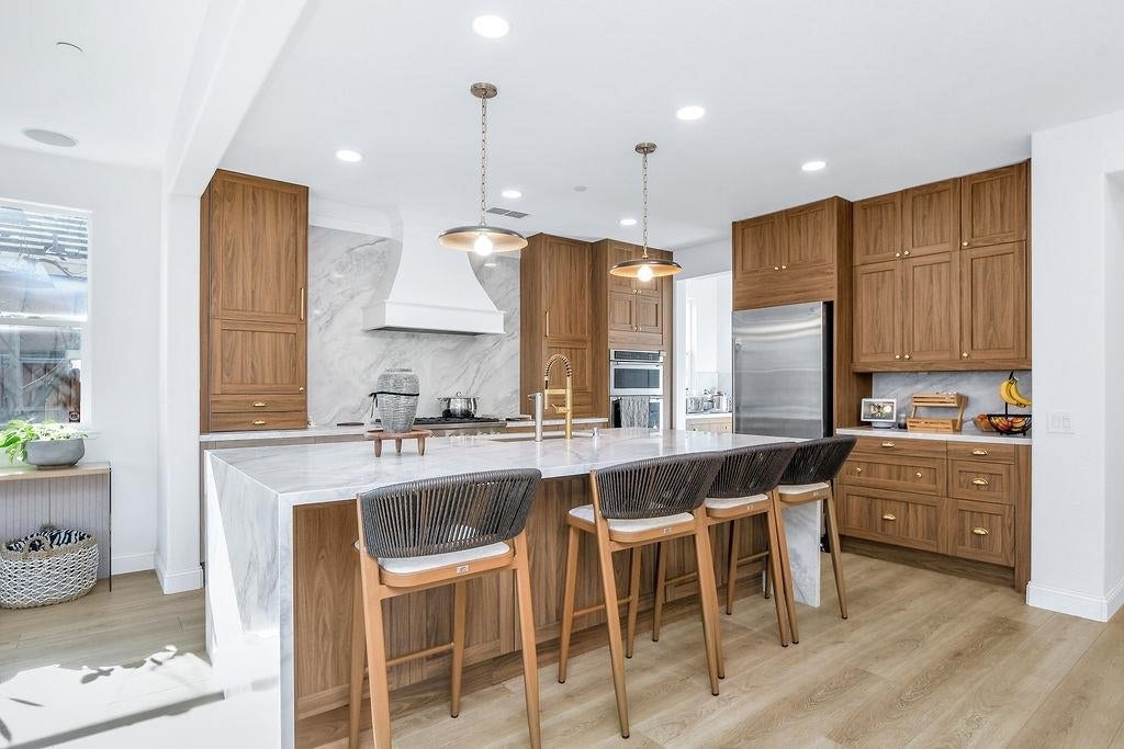 Stunning luxury home offering 5 bedrooms and 5.5 bathrooms across 3,901 sq ft of thoughtfully designed living space on an 8,395 sq ft lot. The highly desirable layout features a downstairs junior suite, along with a flex room and spacious great room, ideal for multi-generational living, work-from-home needs, or entertaining. The remodeled kitchen anchors the home with a modern, upscale aesthetic and flows seamlessly into the main living areas. Step outside to an expansive backyard showcasing a California room with fireplace, perfect for year-round indoor-outdoor living, plus multiple mature fruit trees that add charm and character. This home combines comfort, scale, and style. Located in the Rose Garden Neighborhood of Brentwood.