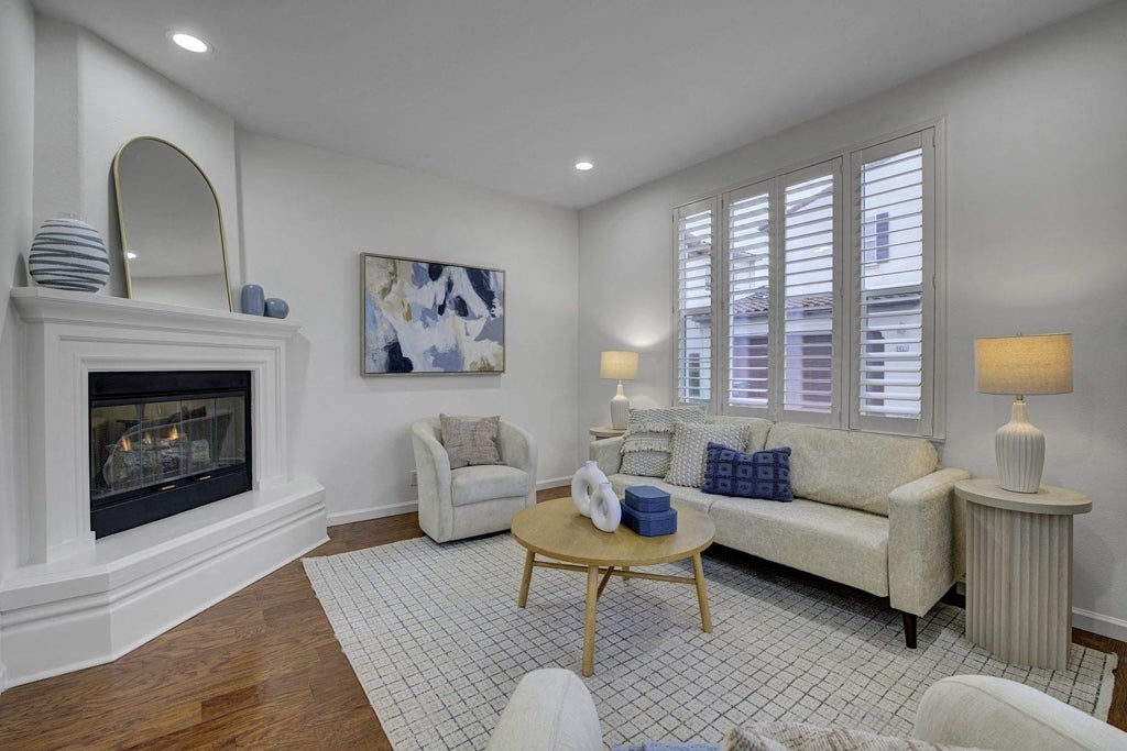 Beautiful Single Family Home in the Highly Sought-After Villa Paseo Neighborhood of Gale Ranch. Rarely available end-lot home offering abundant natural light and excellent ventilation. From the moment you enter, you’ll appreciate the gleaming hardwood floors, soaring nine-foot ceilings, and elegant custom plantation shutters that create a bright and welcoming atmosphere. The spacious living room flows seamlessly into a separate dining area, providing the perfect setting for both everyday living and entertaining. The light-filled eat-in kitchen features stainless steel appliances, gleaming white cabinetry, tile countertops, and ample storage. Upstairs, you’ll find three generously sized bedrooms and two and a half well-appointed bathrooms. The home has been beautifully maintained and is truly light and bright throughout. Additional highlights include a gas fireplace, large two-car garage with abundant storage, built out primary suite closet and a low-maintenance backyard. Enjoy low HOA dues which include access to the community pool and greenbelt. Ideally located near top-rated schools, parks, shopping, restaurants, City Center, this home offers comfort, convenience, and exceptional value in one of Gale Ranch’s most desirable neighborhoods!