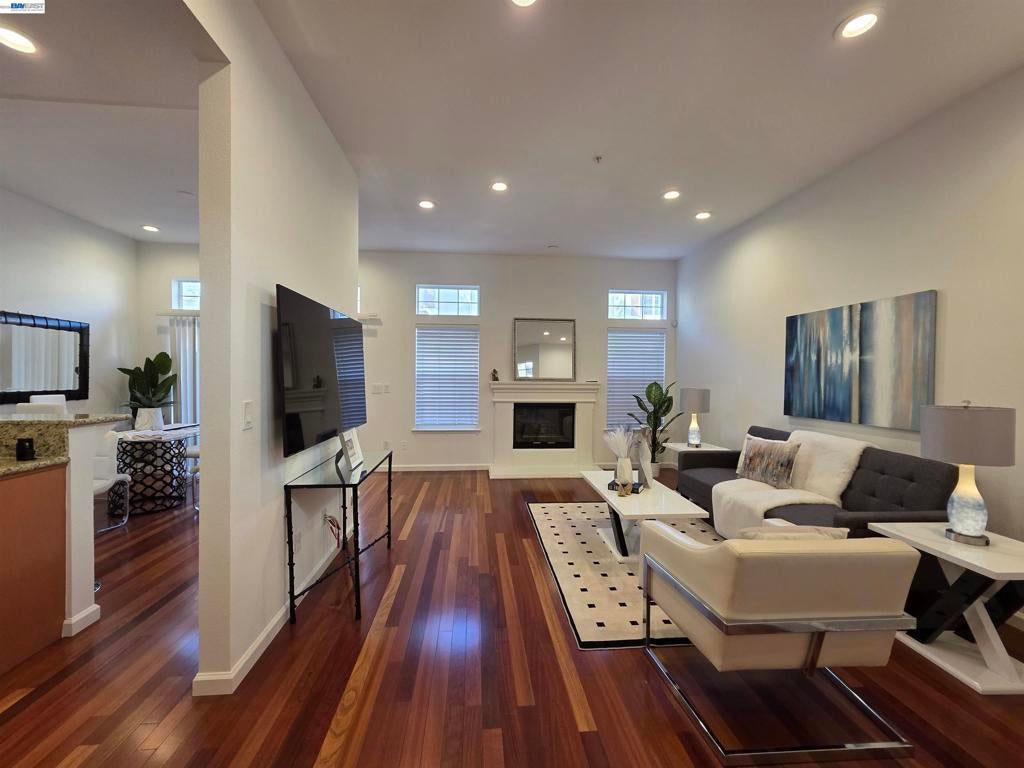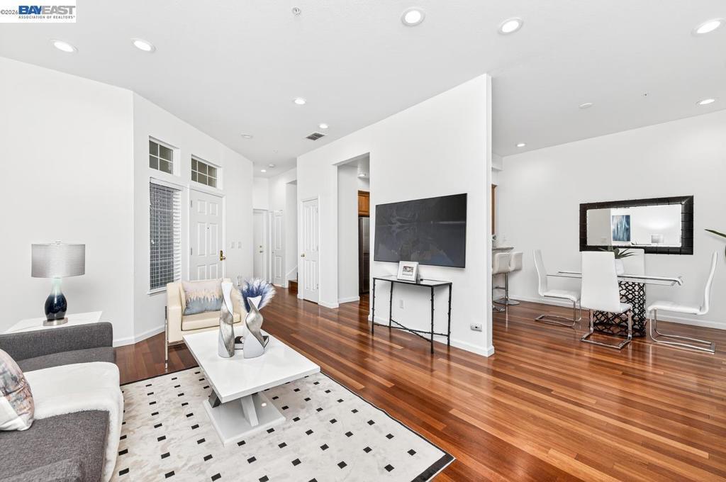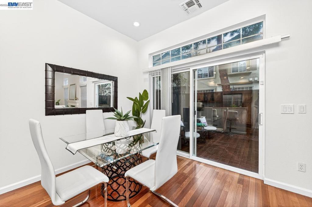 Welcome to this stunning, well-maintained 2-bedroom, 2.5-bathroom townhome located in the highly sought-after Sienna Community of Pleasanton. Filled with abundant natural light, this modern residence features stylish LED lighting throughout and fresh interior paint, creating a bright and inviting atmosphere. The first floor offers a desirable open-concept layout, seamlessly connecting the living room, dining area, and kitchen—perfect for both everyday living and entertaining. The upgraded kitchen showcases stainless steel appliances, sleek finishes, and a convenient breakfast bar ideal for casual dining. The dining area opens to a charming private backyard through a sliding glass door, providing the perfect setting for outdoor relaxation and gatherings. Upstairs, the spacious primary suite features a vaulted ceiling and a private en-suite bathroom. An additional generously sized bedroom and a second full bathroom complete the upper level. Additional highlights include a side-by-side two-car garage for added convenience. New HVAC! Residents of the Sienna Community enjoy exceptional amenities, including a pool, spa, and picnic areas—all with a low HOA fee. Located within the award-winning Pleasanton school district and ideally situated near BART, I-580, I-680, and shopping.