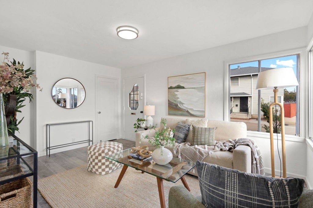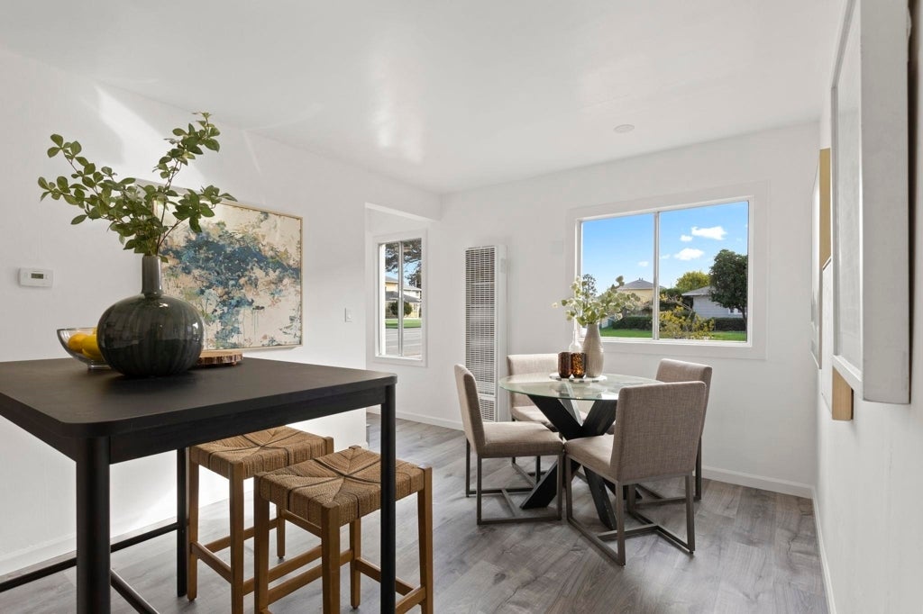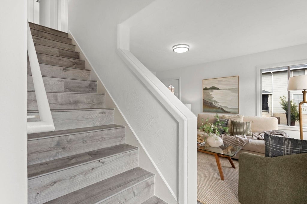 Tucked into a desirable corner location within the Woodstock Co-Op of Alameda, this expanded two-story home offers a rare and thoughtfully enhanced floor plan. Unlike the standard layout, this residence includes a third bedroom and half bath on the main level, creating added flexibility for guests, a home office, or multi-generational living. The interior feels bright and refreshed with an updated kitchen that flows seamlessly into the living and dining areas. Luxury vinyl plank flooring runs throughout, complemented by fresh interior paint, updated electrical, a new water heater, and in-unit laundry. The corner positioning brings added privacy and natural light, enhancing the home’s open feel. Upstairs, two bedrooms and a full bath provide comfortable separation, while the additional main-level bedroom and half bath truly set this home apart. Conveniently located near Alameda Landing, Webster Street, Alameda Naval Base, and the SF Ferry buildings. Enjoy the plentiful of breweries, local gyms, Alameda's Antique Fair, and weekly farmers' market! A rare opportunity to own a uniquely expanded and move-in ready home in Woodstock.