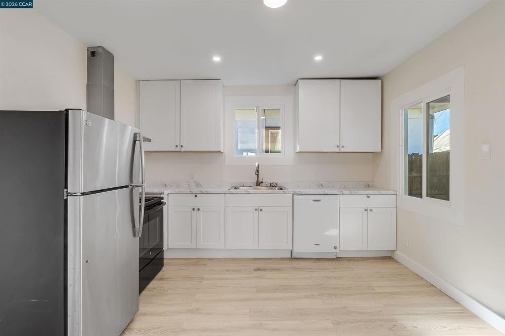 Welcome to this beautifully updated bungalow in Vallejo! This charming 2-bedroom, 1-bath home offers 674 sq ft of thoughtfully refreshed living space and is truly move-in ready. The seller has completed a full bathroom remodel and a stylish kitchen renovation, featuring new cabinets, new doors, updated lighting, a new dishwasher, and a new sink, along with fresh interior paint throughout for a clean, modern finish. Outside, you’ll find a detached garage and shared driveway, providing convenient parking and additional storage. A new fence adds privacy and enhances the outdoor space—perfect for relaxing or entertaining without the maintenance of a larger yard. Ideal for first-time buyers, downsizers, or investors looking for a turnkey opportunity. Priced at $405,000, this home delivers comfort, style, and value in one smart package.