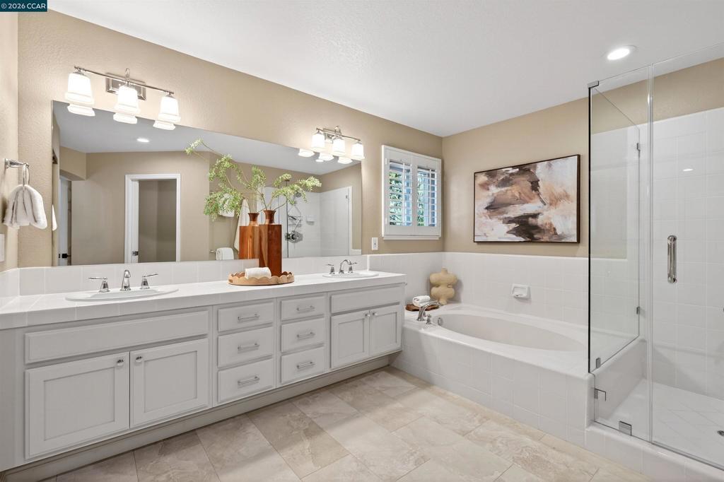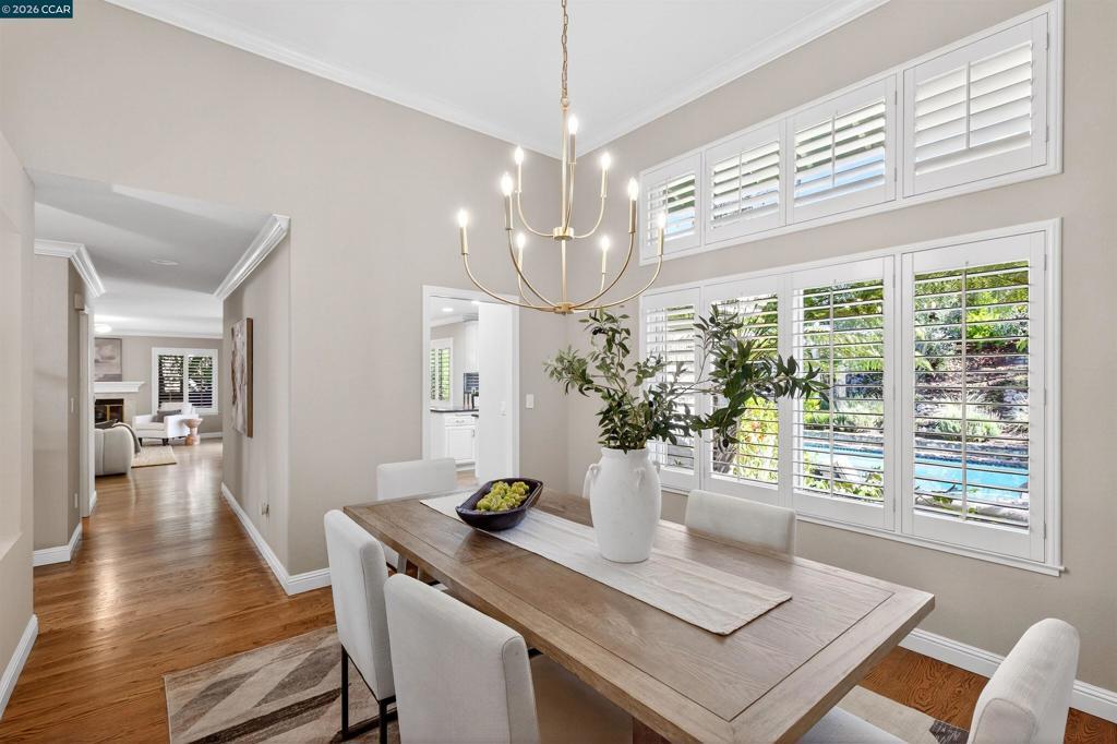 Pride of ownership radiates throughout this updated and refreshed home! Versatile turnkey 4 BR plus sitting room/study and bonus room. Gleaming hardwood floors, Andersen windows and doors and plantation shutters throughout add continuity and present a quality ambience. The resort-like yard beckons with sparkling pool and raised spa with cascading waterfall, covered patio, inviting stone outdoor fireplace and mature and colorful plantings. Chef's kitchen offers center island, wine refrigerator, built in refrigerator, 5 burner gas cooktop, and planning desk. The set-apart Deer Ridge enclave is conveniently located near top ranked schools, shopping, dining and freeway access. Enjoy San Ramon living at its best! Buyers will love this "turnkey" home. Open House Saturday (3/21) from 1-4 and Sunday (3/22) from 1-4.