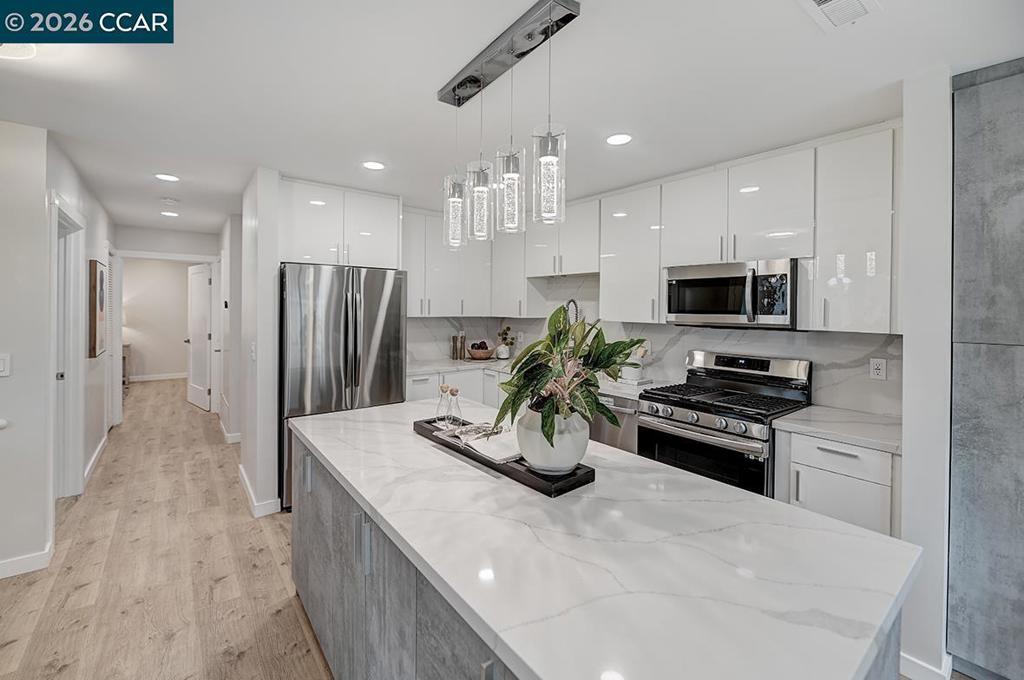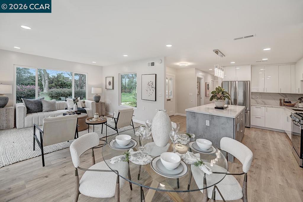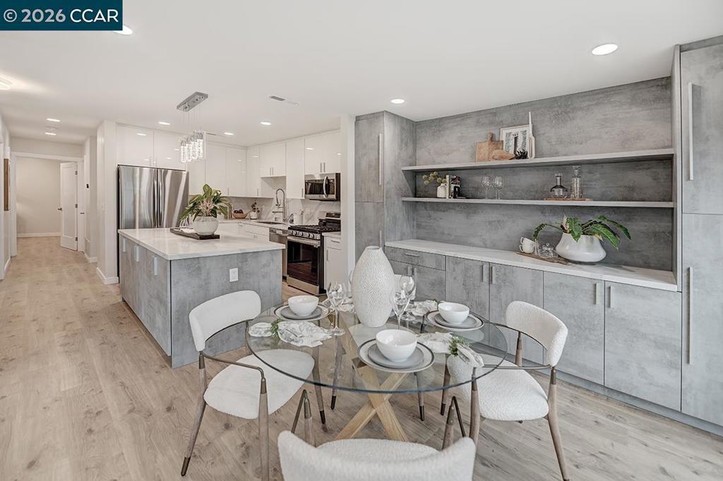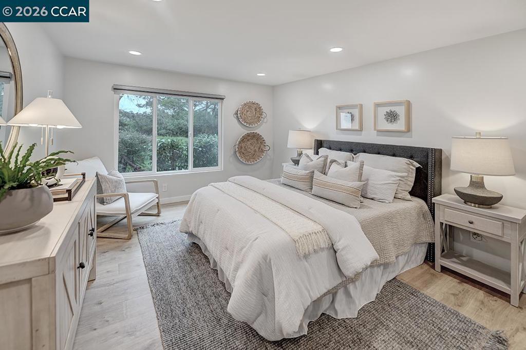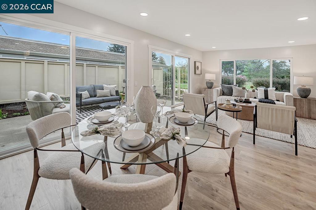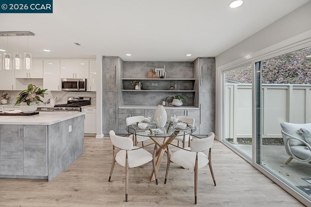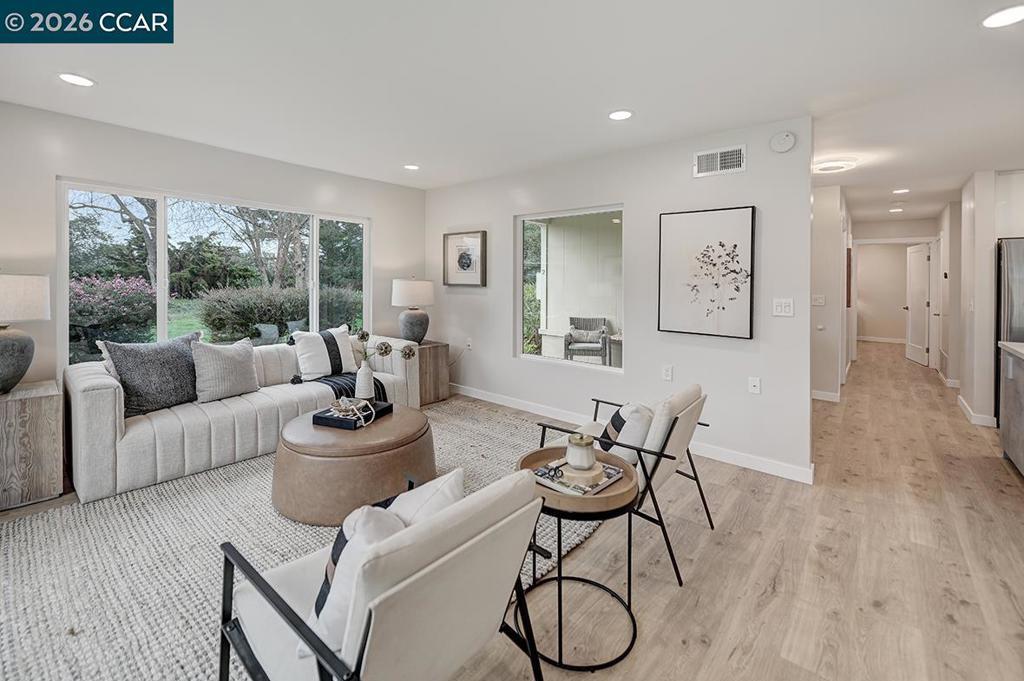 Spectacular totally remodeled Yosemite, 2 bedroom, 2 bath, LEVEL IN beauty! Mt Diablo views from the Primary Bedroom with a peaceful park like common area.. Nestled in an exclusive single row building, this corner/end unit boasts access to open space, a stunning view, no neighbors in the front, above or below. Open floor plan, skylights and a kitchen that features a spacious island, floor to ceiling high end Mirlux cabinets, quartz countertops, and stainless steel appliances. The dining room showcases a stunning soft gray built in full wall buffet cabinetry. Hard surface flooring throughout. Fully enclosed patio off the kitchen and living room has an open panel gate for visibility out to the front grassy area. Truly unique floor plan culminates in an expansive master bedroom with a spacious walk in closet. Two bathrooms with beautifully tiled showers. Hidden stacked washer/dryer. Walk to outdoor pool and lawn bowling. A MUST SEE! Views: Ridge
