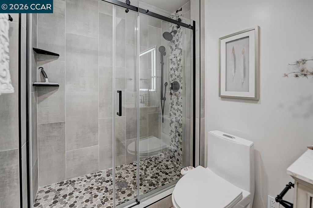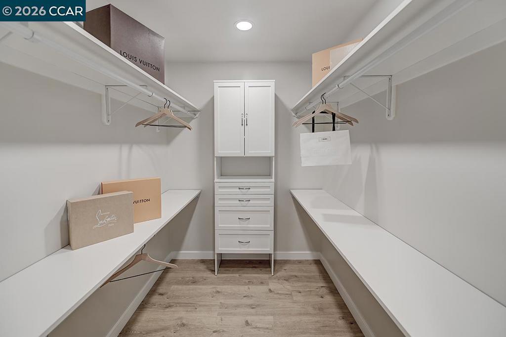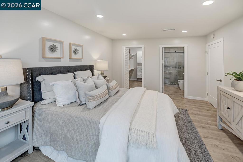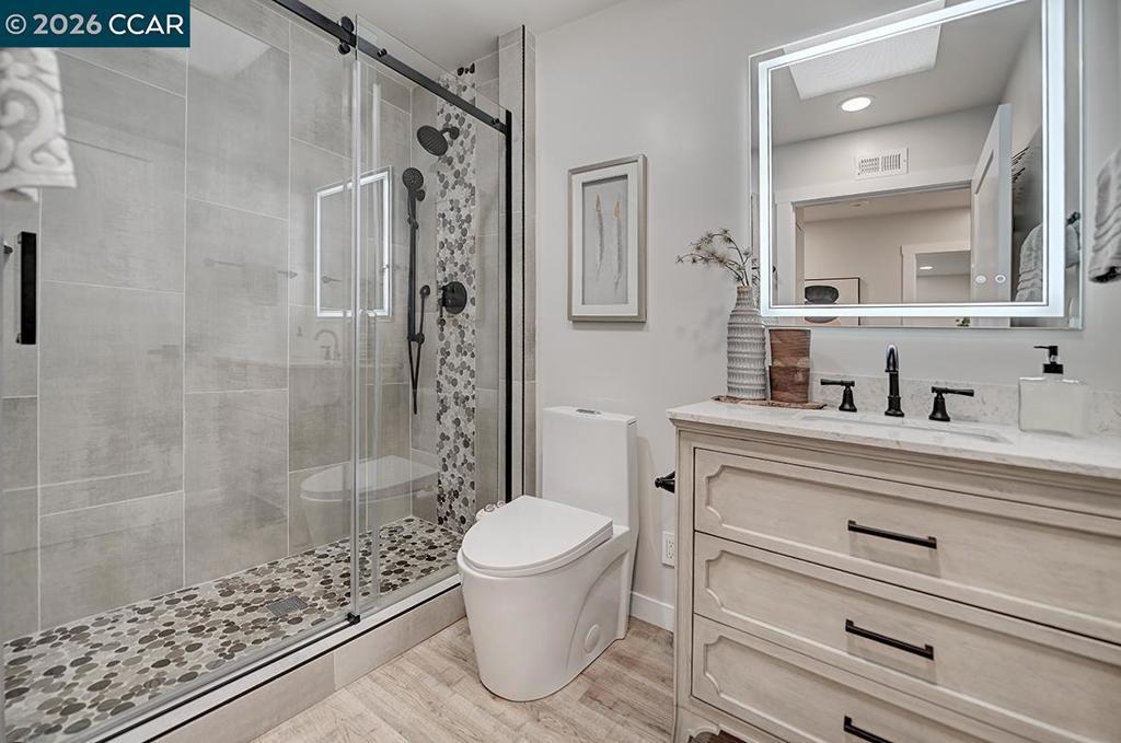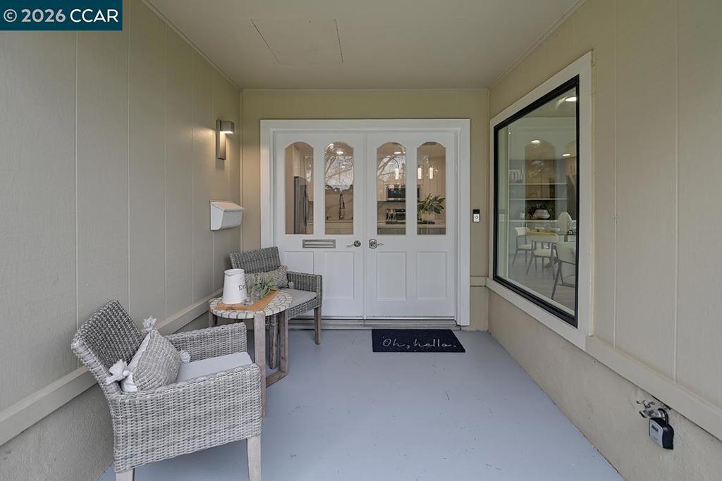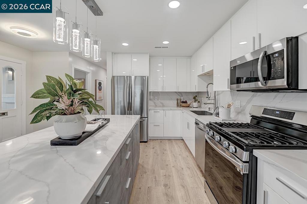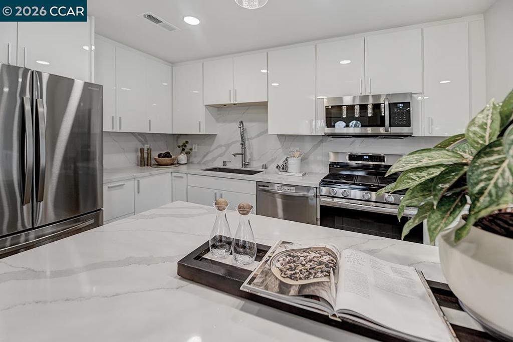 Spectacular totally remodeled Yosemite, 2 bedroom, 2 bath, LEVEL IN beauty! Mt Diablo views from the Primary Bedroom with a peaceful park like common area.. Nestled in an exclusive single row building, this corner/end unit boasts access to open space, a stunning view, no neighbors in the front, above or below. Open floor plan, skylights and a kitchen that features a spacious island, floor to ceiling high end Mirlux cabinets, quartz countertops, and stainless steel appliances. The dining room showcases a stunning soft gray built in full wall buffet cabinetry. Hard surface flooring throughout. Fully enclosed patio off the kitchen and living room has an open panel gate for visibility out to the front grassy area. Truly unique floor plan culminates in an expansive master bedroom with a spacious walk in closet. Two bathrooms with beautifully tiled showers. Hidden stacked washer/dryer. Walk to outdoor pool and lawn bowling. A MUST SEE! Views: Ridge
