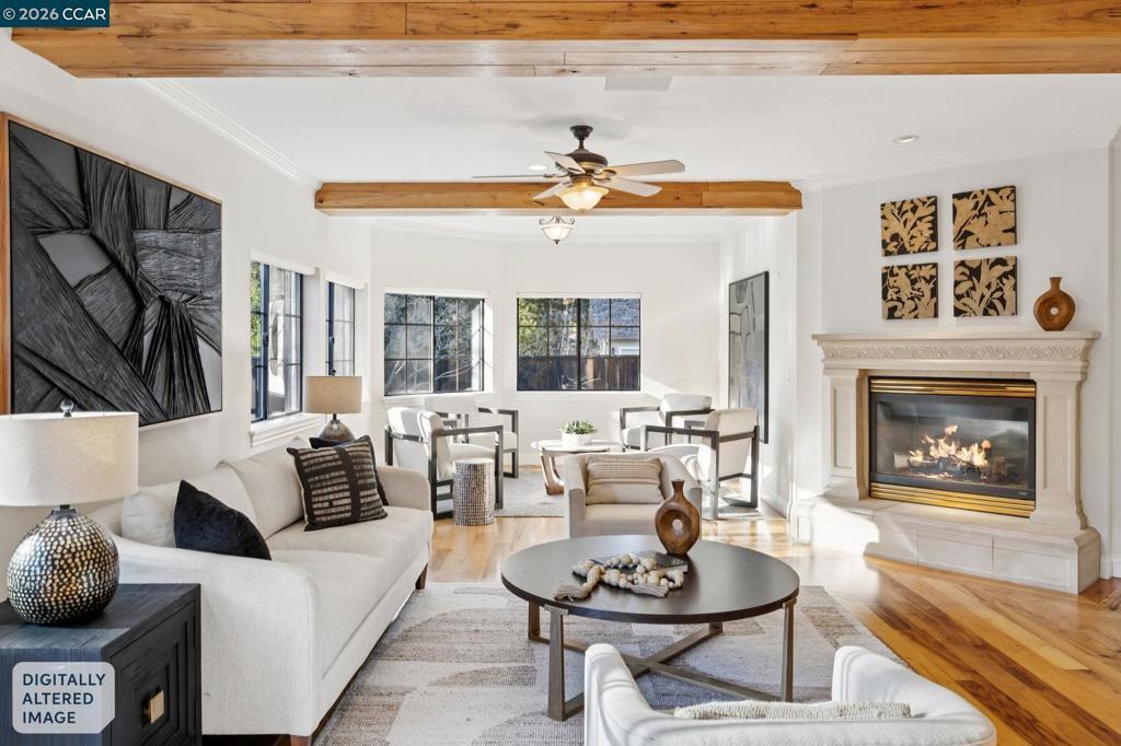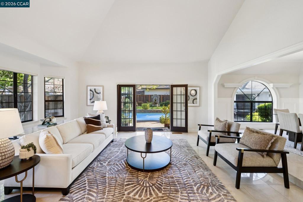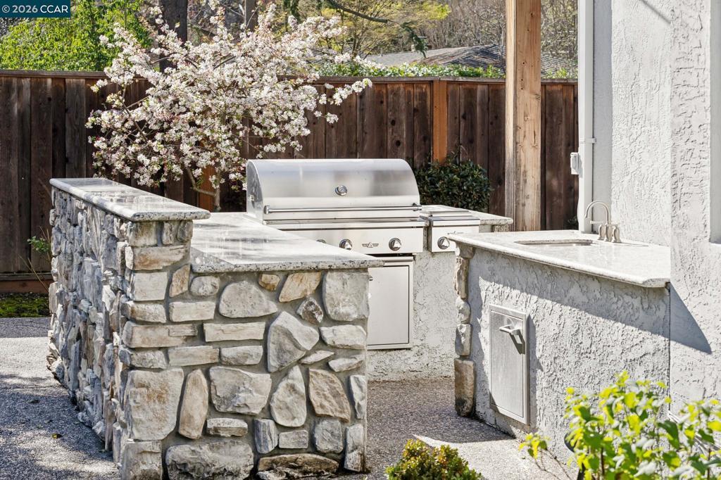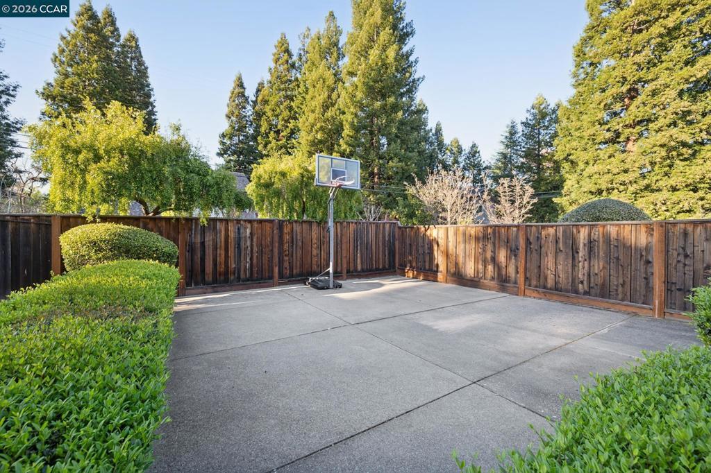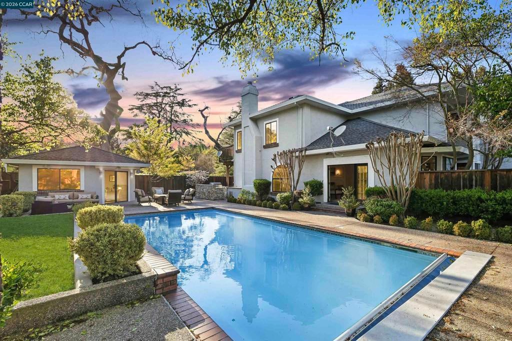 This custom Westside Alamo estate sits on a flat half-acre showcasing resort-inspired grounds and seamless indoor-outdoor living. The private backyard feels like a boutique resort with a sparkling pool and spa, expansive entertaining deck, outdoor kitchen, fire pit, fountain, sport court and a charming cabana with a full bath—perfect for gatherings or peaceful evenings at home. The residence offers 5 spacious bedrooms and 5.5 baths, including a main-level en-suite ideal for guests, plus an executive office. A beautifully appointed gourmet kitchen with high-end stainless appliances, stone counters, and crisp white cabinetry opens to the inviting family room with a fireplace and deck access. Elegant living and dining spaces, soaring ceilings, and extensive hardwood floors elevate the main level. Upstairs, the luxurious primary retreat features a sitting area, fireplace, and dual walk-in closets. All bedrooms are oversized and en-suite. Fresh finishes and updated lighting are found throughout the home. Ideally located minutes to BART, freeway access, Iron Horse Trail, and top-rated schools.