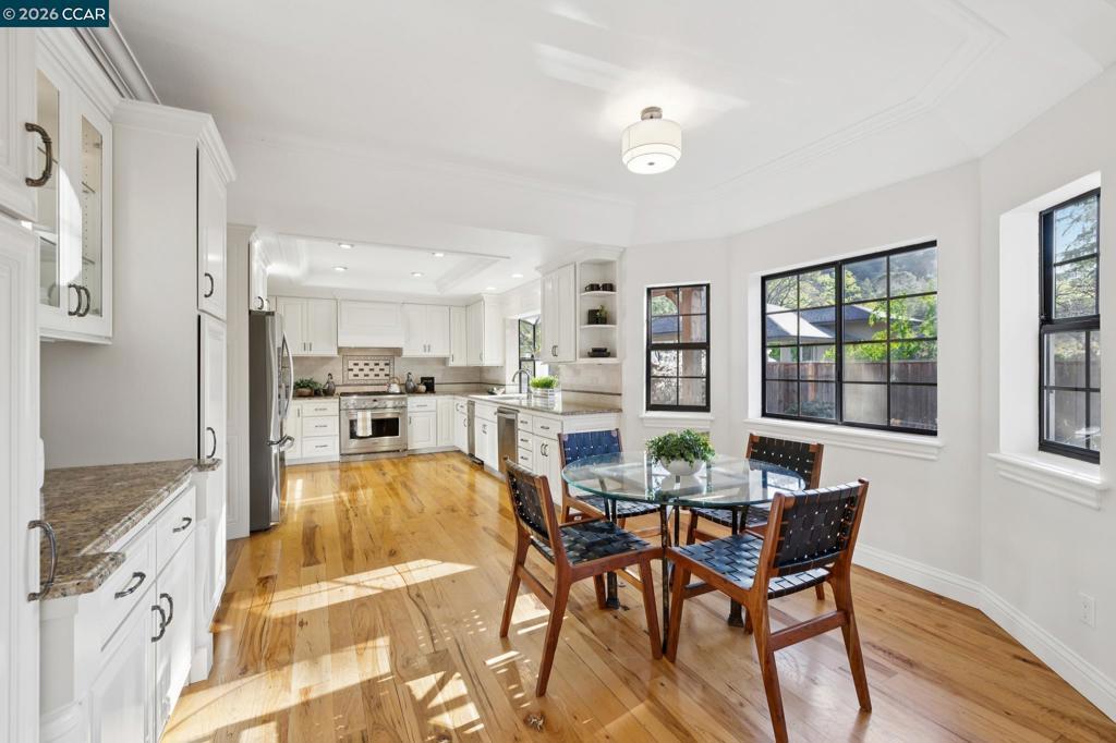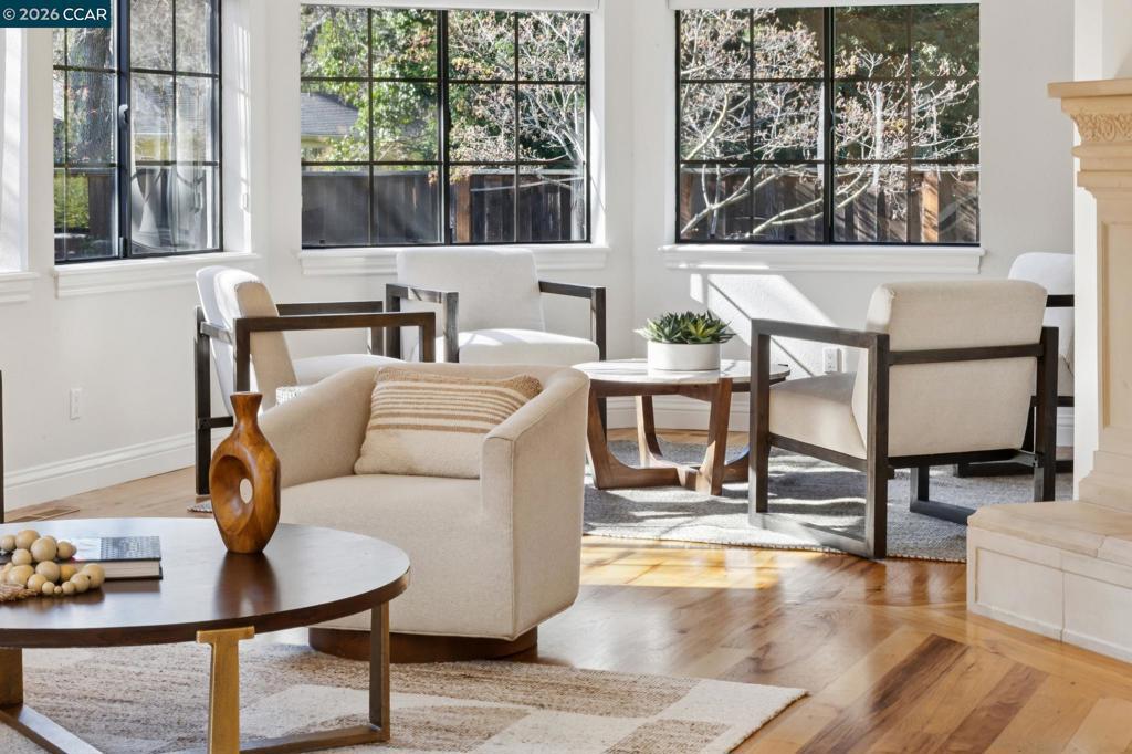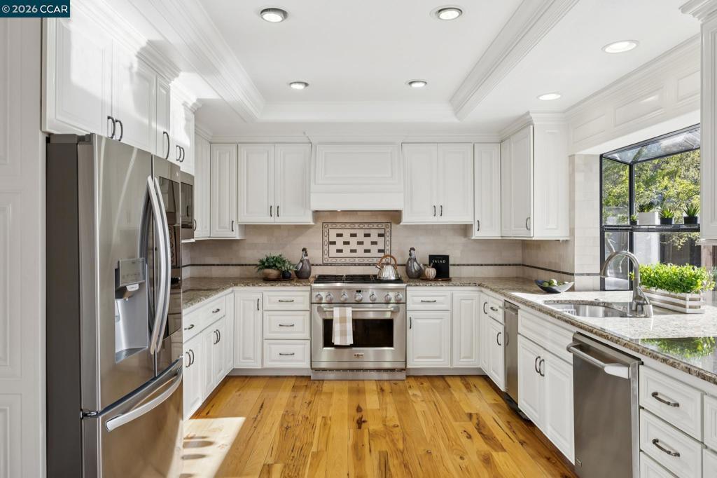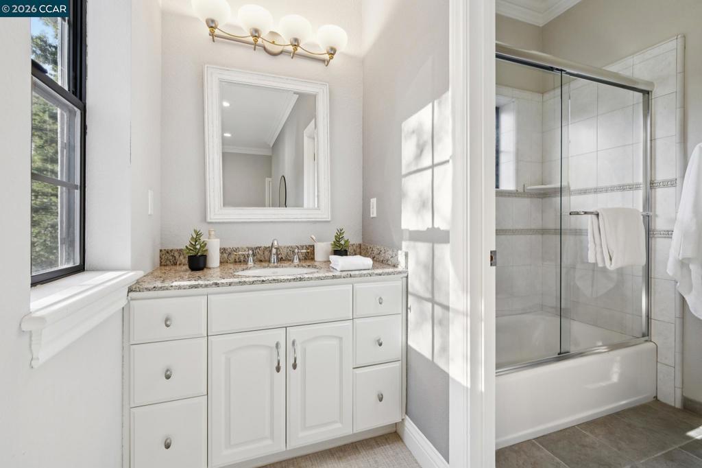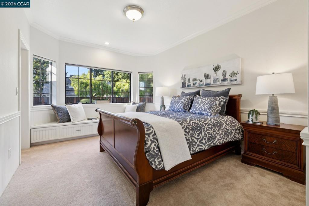 This custom Westside Alamo estate sits on a flat half-acre showcasing resort-inspired grounds and seamless indoor-outdoor living. The private backyard feels like a boutique resort with a sparkling pool and spa, expansive entertaining deck, outdoor kitchen, fire pit, fountain, sport court and a charming cabana with a full bath—perfect for gatherings or peaceful evenings at home. The residence offers 5 spacious bedrooms and 5.5 baths, including a main-level en-suite ideal for guests, plus an executive office. A beautifully appointed gourmet kitchen with high-end stainless appliances, stone counters, and crisp white cabinetry opens to the inviting family room with a fireplace and deck access. Elegant living and dining spaces, soaring ceilings, and extensive hardwood floors elevate the main level. Upstairs, the luxurious primary retreat features a sitting area, fireplace, and dual walk-in closets. All bedrooms are oversized and en-suite. Fresh finishes and updated lighting are found throughout the home. Ideally located minutes to BART, freeway access, Iron Horse Trail, and top-rated schools.