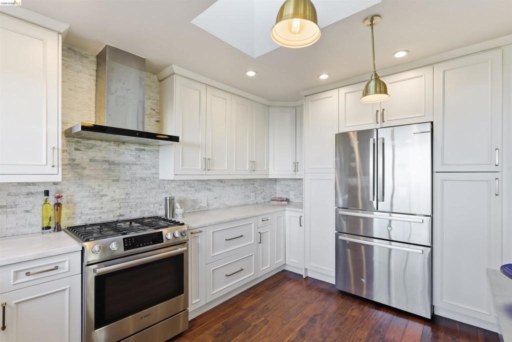 Wake up to sweeping Bay views and end each day with a sky full of color and city lights. Perched high in the coveted El Cerrito Hills, this 3BD/2.5BA home offers a rare sense of peace, privacy, and perspective. Walls of glass fill the home with natural light, while the open layout flows seamlessly to two expansive decks—perfect for sunset dinners, morning coffee, or simply taking in the Golden Gate Bridge, Bay Bridge, and shimmering skyline. A private hot tub and pergola offers a front-row seat to the ever-changing sky. Inside, warm wood floors and refined finishes create a welcoming atmosphere, complemented by a modern kitchen designed for both daily living and easy entertaining. A long private driveway leads to a spacious front patio and yard—ideal for gatherings or quiet retreat. The detached 2-car garage with bonus space offers endless flexibility for a home office, studio, guest suite, or potential ADU. Surrounded by scenic trails yet close to BART and major routes, this home blends elevated living with everyday convenience.