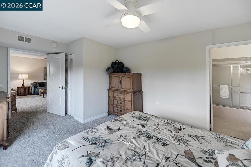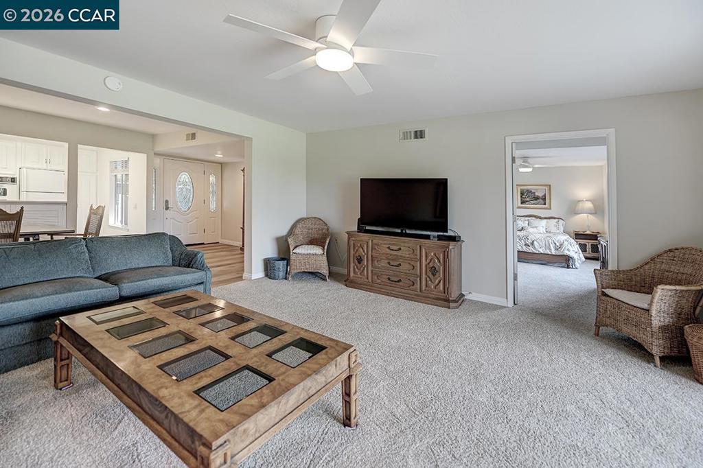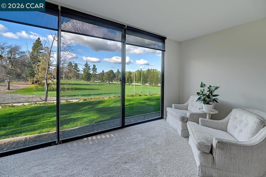 Amazing view of golf course. This reconfigured end unit Carmel features two bedrooms and two bathrooms. Enjoy the walk-in closet in the primary, the convenience of an in-unit washer dryer, recessed lights and pretty ceiling fans in living room and bedrooms. This home features an additional enclosed office or den, perfect for work or relaxation, with serene park-like settings and unobstructed views of the expansive golf course, lake and rolling hills. Great location, just a short distance from the restaurant, golf and Event center, providing the perfect blend of leisure and lifestyle. The wrought iron gated front patio offers extra storage and privacy, along with a side yard with gate. Perfect for walking your dog. Wonderful neighbors have a weekly get-together.