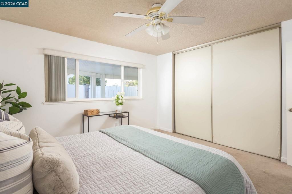 A RARE value find in Brentwood, this cute single-story duet property is 975sqft with 2 spacious bedrooms and 1 full bathroom plus NO HOA. The best perk is the unique almost 5,000sqft corner lot with plenty of privacy and space in both the front and backyard, plus the large attached 2 car garage with epoxy flooring. Walking inside, you're greeted by a large open living & dining combo space with great natural light and fireplace. Perfect for cozy nights and summer days! The kitchen is just the right size with tile countertops, recessed lighting, fridge included, and a window above the sink overlooking the front yard space. The two spacious bedrooms both include great large closets and fresh paint. The backyard includes a massive covered patio perfect for enjoying our wonderful year round weather plus large backyard area with fresh mulch and shed. Also note there is all new insulation in the attic space. Refrigerator, Washer, and dryer all included as well! This home has so much to offer for the price- come see it for yourself!