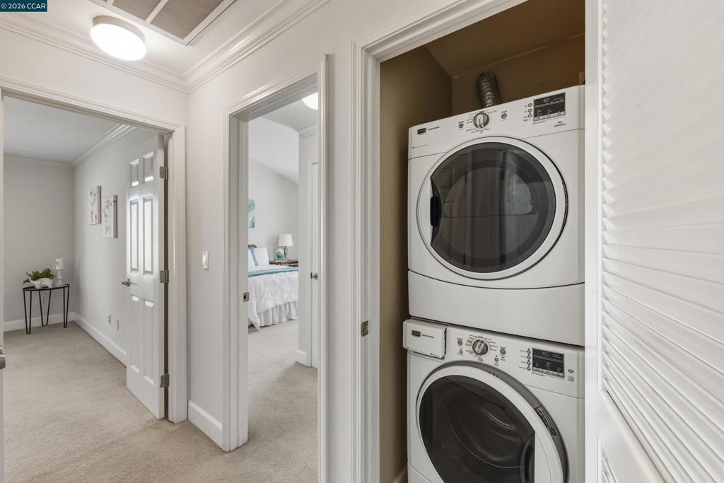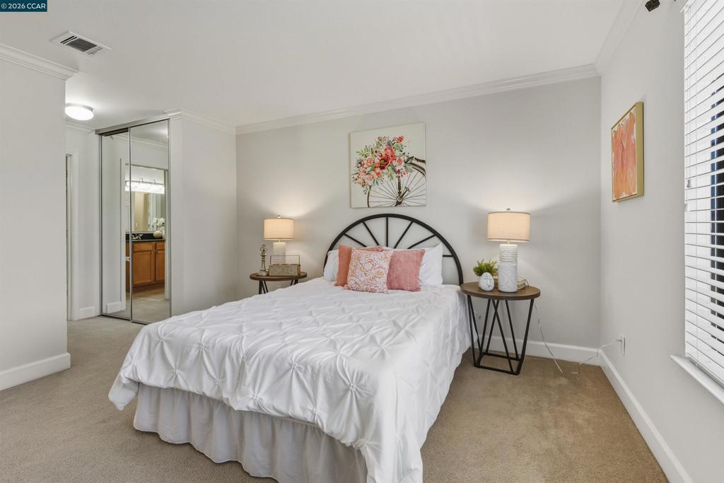 Beautifully maintained Eastridge upper-level condo at the top of San Ramon's Bollinger Canyon Rd. Gated community w/in a mile of City Center, year-round farmers market, The Marketplace shops, restaurants, Central Park, library, community ctr, Iron Horse Trail. 1074+/-SF. 2 bds w/en suite bathrooms, mirrored closet drs. 2 bathrooms w/single sink vanities, tub/shower combos. Inviting entry. Vaulted ceilings. Fresh int paint. Crown molding. Tile & carpeted floors. Updated central AC (2019). Abundant natural light. Living rm w/wood-burning fireplace, slider to view balcony & storage closet. Dining area, ceiling fan/light. Well-appointed kitchen w/granite counters, richly stained cabinetry, upper glass-faced cabinets, stainless steel refrigerator, new Samsung range, dishwasher & microwave. Front-facing window over stainless-steel sink. Washer/dryer behind closet drs. Multiple storage closets. Updated exterior. Exclusive enclave of condos on park-like grounds. Towering redwoods. Walking trails. App-controlled security gate. Access to 2 swimming pools, spas, gym. Entertain family & friends at clubhouse. Located between Canyon Lakes & The Bridges Golf Courses. Near freeway. Top-rated SRVUSD schools w/in 2 mi. Assigned parking space. Abundant guest parking.