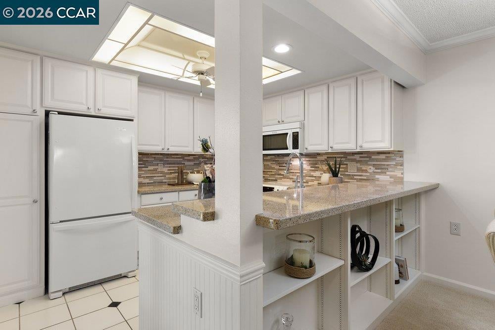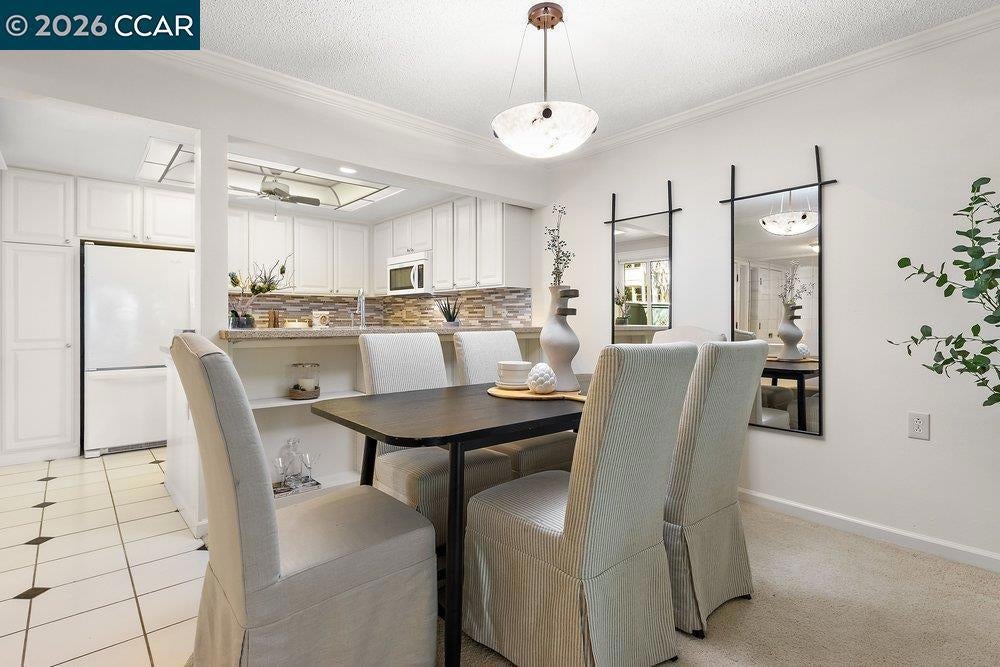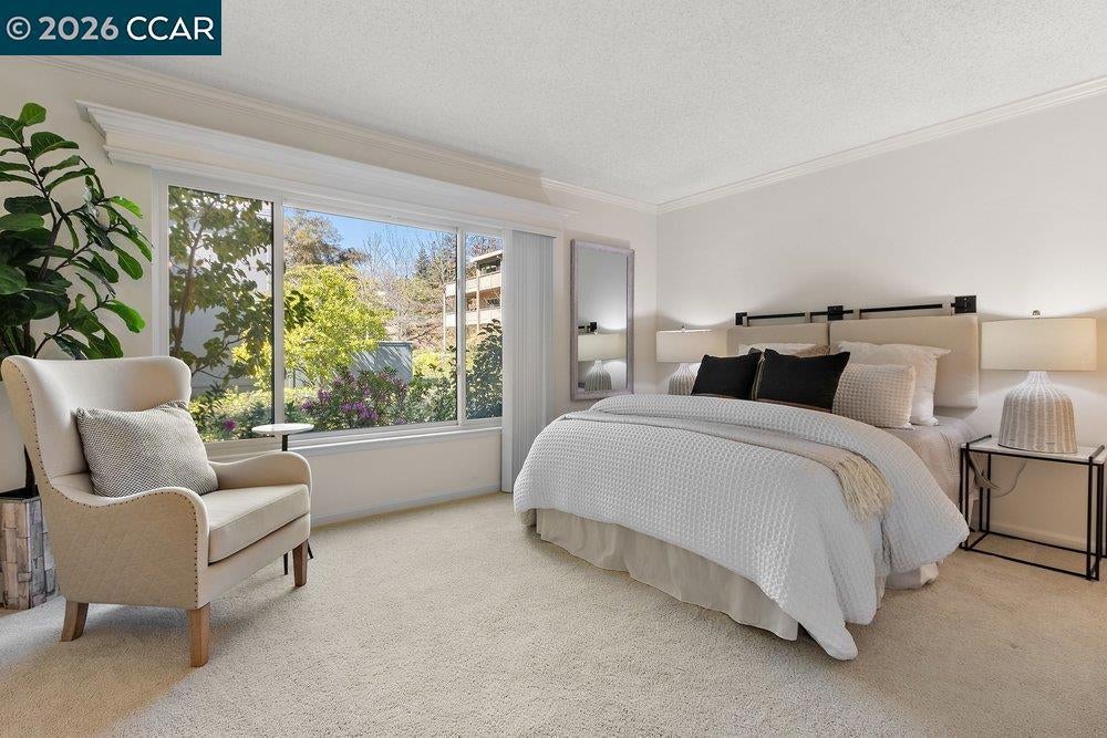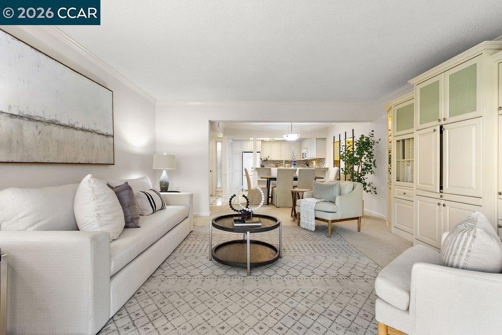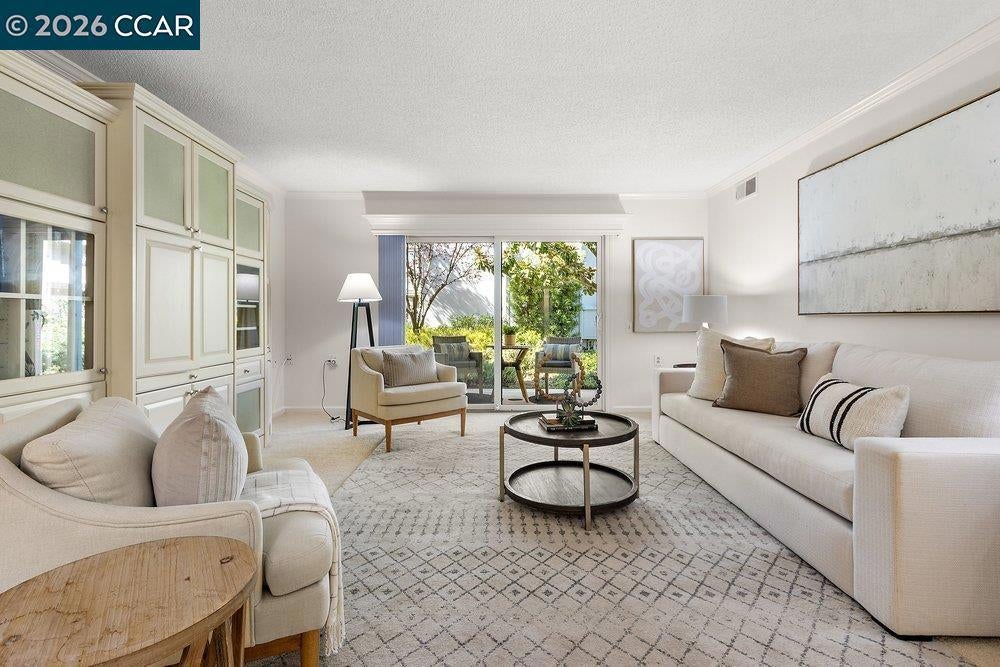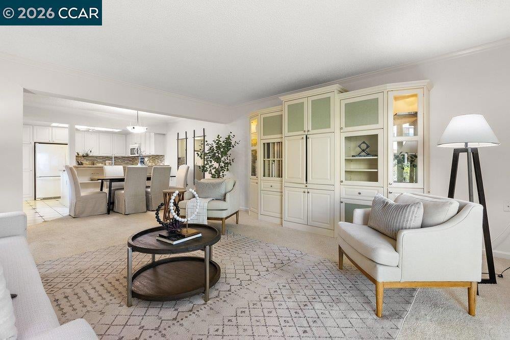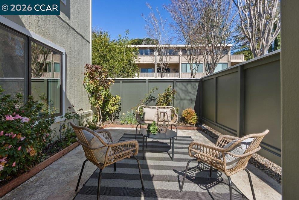 Lovely Carmel model with rare two bedroom, two bathroom layout. Charming end-unit location with lawn and garden-like setting from back patio. Large, fenced front patio provides tons of room for outdoor living. Home updated throughout with dual-pane windows and slider, crown molding, baseboards, and wainscoting. The Kitchen has updated cabinet fronts, stone counters, and mini-tile backsplash. Built-in entertainment center in the Living Room and added shelves in the Dining Area provided lots of great storage options. The Secondary Bedroom makes a great office with a built-in desk and bookshelf system that extends the cabinetry under the window, making a perfect window seat. A Murphy Bed in that room is perfect for providing a bed for guests that can be easily stowed to save floor space. Laundry is a breeze with a stacked washer/dryer in the Guest Bathroom and there's lots of additional storage available in the closet off the front patio and in the carport just steps away from the front door.