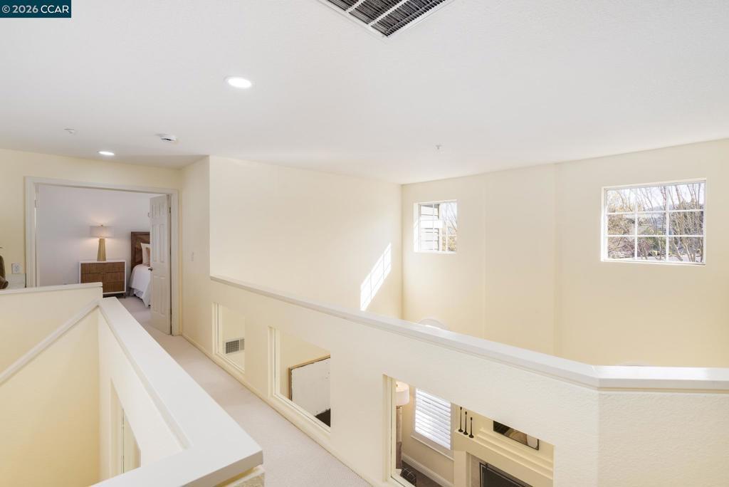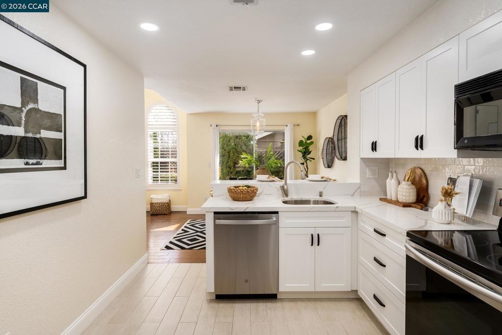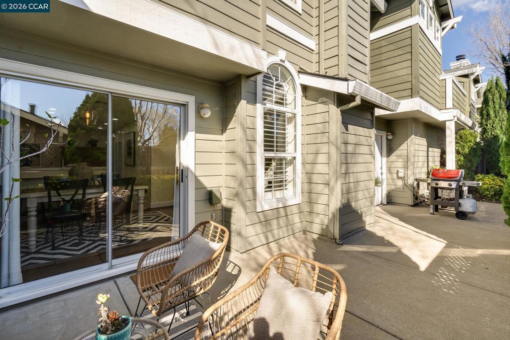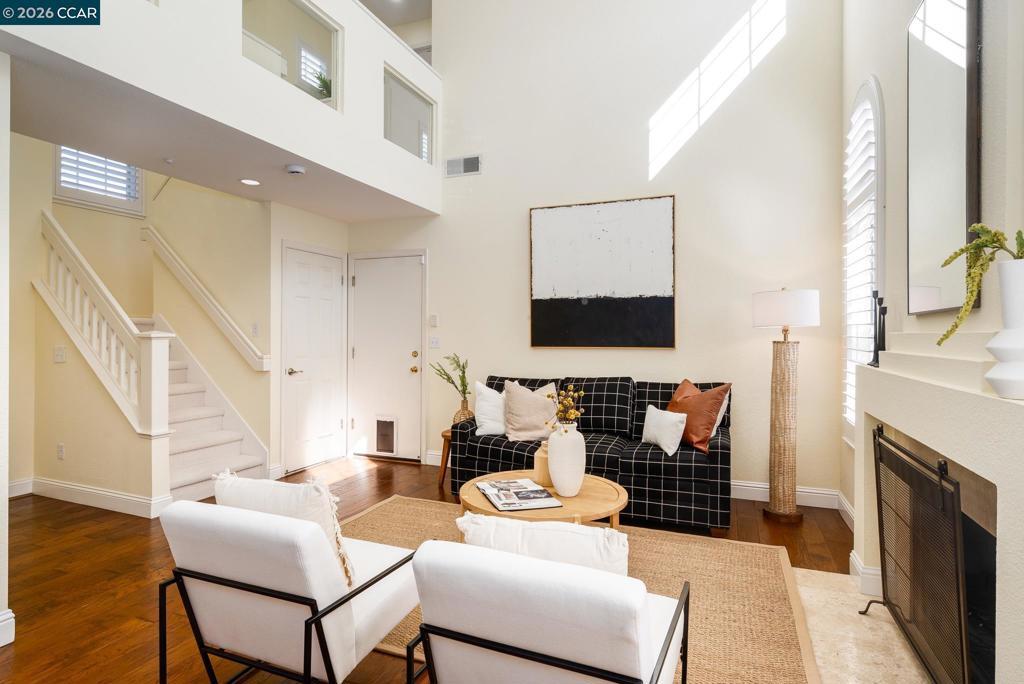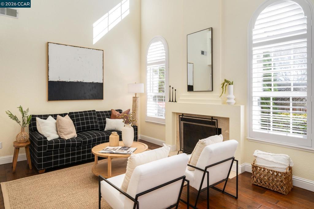 Nestled on a quiet tree-lined lane in a charming Westside San Ramon neighborhood, this beautifully updated townhouse offers style, comfort, and an exceptional location. The light-filled open floor plan features soaring ceilings, rich hardwood floors, custom white plantation shutters, and designer lighting throughout. The inviting living room includes a cozy fireplace and large windows that bring in abundant natural light. The gourmet kitchen is thoughtfully appointed with white custom cabinetry, Quartz countertops, newer stainless steel appliances and flows seamlessly into the dining area and main living space.. The spacious primary suite offers privacy, vaulted ceilings, and a spa-inspired bath with dual vanities, walk-in shower and designer tile finishes. Two additional bedrooms share a beautifully updated split bathroom. Additional highlights include an attached two-car garage, ample storage, and a private backyard for outdoor enjoyment. HOA-maintained front landscaping and access to a sparkling community pool enhance the lifestyle. Ideally located near award-winning schools, parks, shopping, Downtown Danville, and convenient freeway access.