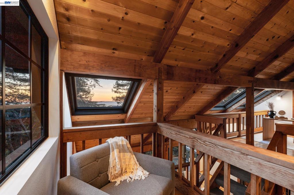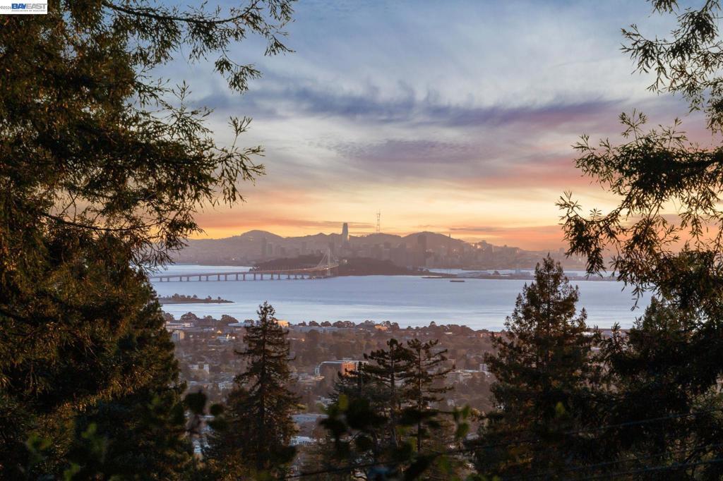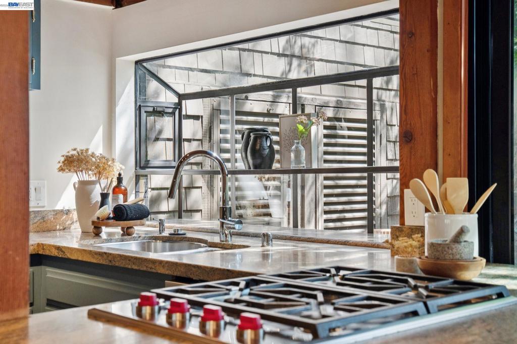 Tucked among the trees in the lower North Berkeley Hills, this striking contemporary home offers a rare sense of privacy and calm. Designed to connect seamlessly with its natural setting, the residence features soaring ceilings, multiple skylights, and decks on every level that bring the outdoors in. Recent updates add a fresh, modern feel while preserving the warmth of natural wood, tile, and stone throughout the home. The entry level includes two generously sized bedrooms, an updated split bathroom, and a shared deck overlooking lush greenery. Upstairs, the main living level showcases a dramatic living room that opens to a wide front deck—an inviting space for entertaining or relaxing among the treetops. At the center of the home, the thoughtfully planned kitchen is equipped with granite countertops, a Wolf cooktop, and new stainless steel appliances installed in 2025. The top floor is devoted to a spacious primary suite featuring its own private deck, along with a neighboring office where a large picture window frames sweeping views of the San Francisco Bay. Set in a tranquil neighborhood known for its network of hidden pathways and nearby parks, the home also offers convenient access to North Berkeley’s renowned dining scene, UC Berkeley, and BART. BESO Energy Score: 3