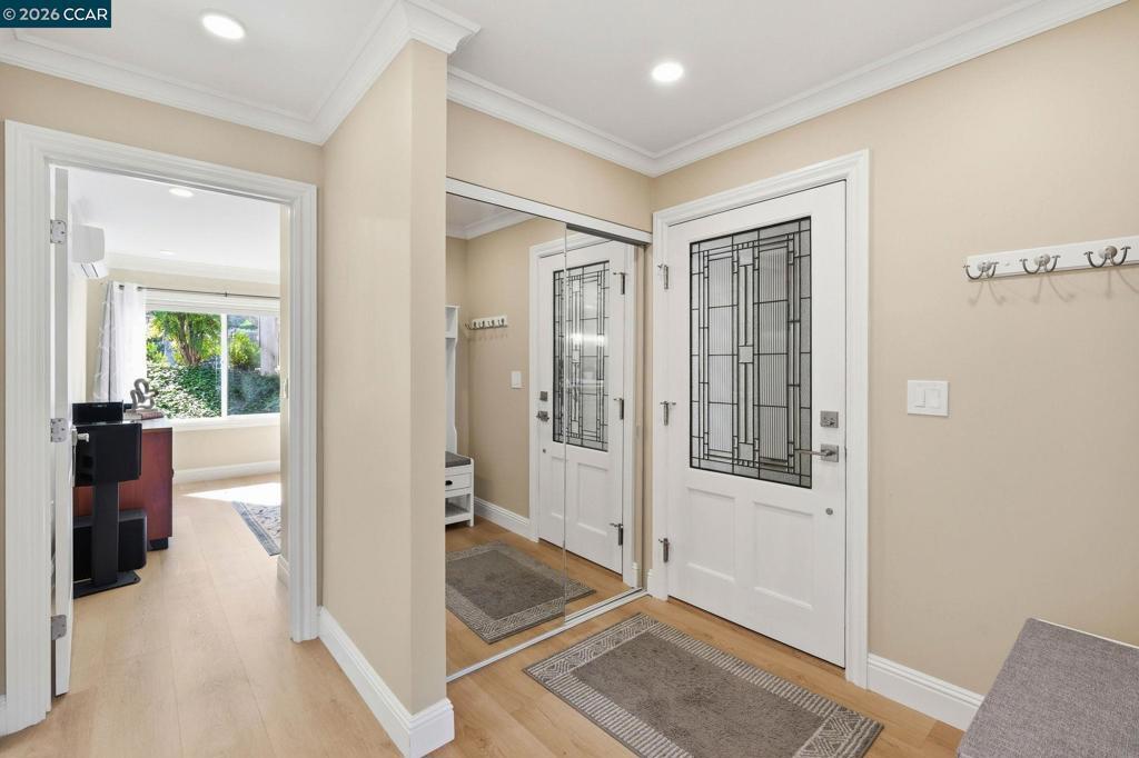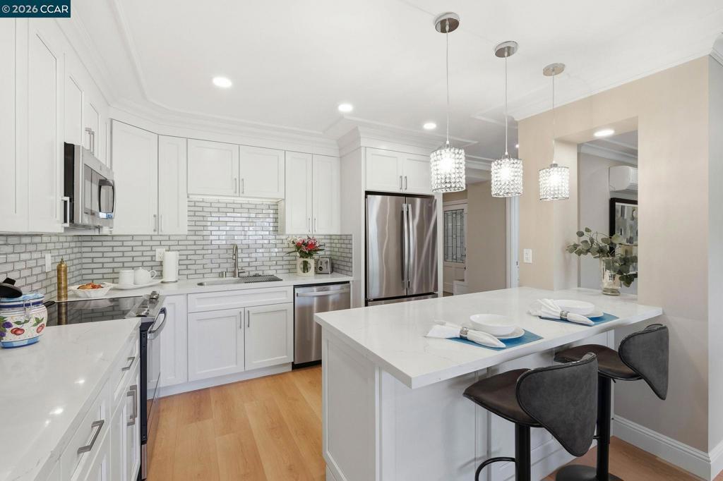 Beautifully reconfigured Claremont model featuring the rare addition of a second full bathroom. Half of the balcony has been enclosed to create a bright office/den, adding flexible living space. Recently updated energy-efficient mini-split systems in each room provide personalized heating and cooling. The remodeled kitchen offers white cabinetry, quartz countertops, stainless steel appliances, breakfast bar, pull-out pantry drawers, built-in recycling/trash, and a wine fridge. Additional upgrades include dual-pane windows and engineered hardwood flooring throughout. The private primary suite features a step-in shower and linen closet, while the guest bath includes a soaking tub with beautifully tiled walls. Spacious utility closet fits washer/dryer. Carport nearby with guest parking just outside the front door.