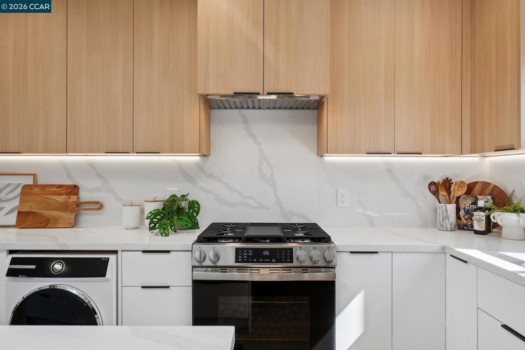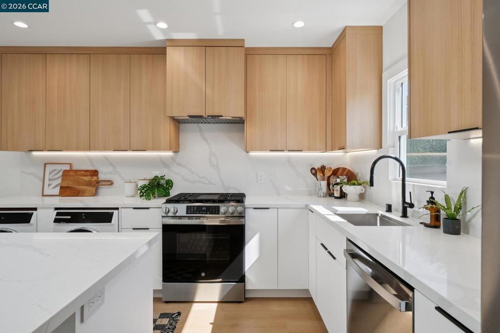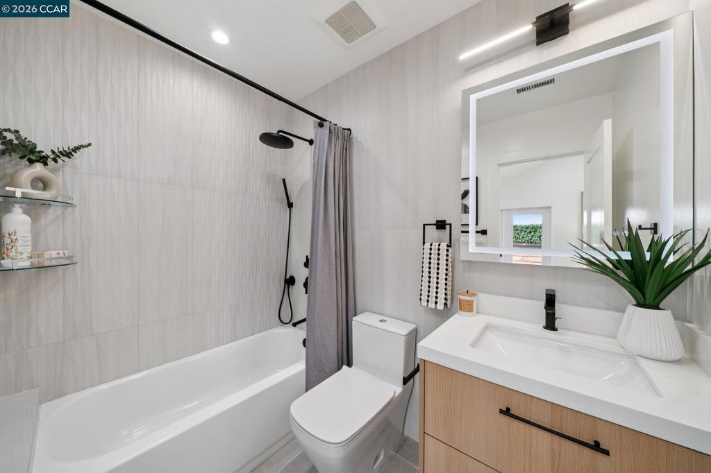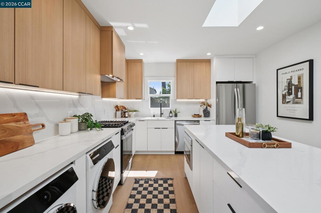 This stunning Berkeley bungalow in the heart of the city has been thoughtfully taken down to the studs and completely reimagined, blending a strong, well-built structure with beautifully curated modern designer upgrades throughout. Designed for modern comfort, the home features new insulation, updated plumbing and electrical systems, and brand-new central heating and air conditioning. A charming layout welcomes you with a dynamic roofline and soaring ceilings that create a bright, open, and inviting atmosphere. The thoughtfully designed floor plan offers two bedrooms and two bathrooms, along with two outdoor deck spaces and a sun-drenched backyard, ideal for embracing Berkeley’s indoor-outdoor lifestyle. At the heart of the home, the skylit kitchen serves as a true chef’s retreat, showcasing sleek two-tone European-style cabinetry with warm wood accents, a striking waterfall quartz island, and under-cabinet lighting that enhances both function and style. Ideally situated in a phenomenal central location near San Pablo Park, Berkeley Bowl, BART, and major highways, offering easy access to shopping, recreation, commuting, and everyday conveniences.
