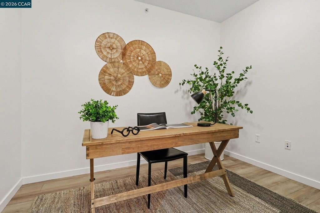 A sought-after floor plan at The Mercer featuring a spacious living room with a cozy gas fireplace, a separate dining area large enough for a round table, and a versatile den. Facing west, the home enjoys filtered afternoon light throughout. Extensive February 2026 upgrades make this residence feel truly move-in ready: new luxury vinyl plank flooring in the entry, den, dining, and living areas; new textured bedroom carpeting; fresh designer white paint; refurbished kitchen and bath grout; a new dining light fixture; and newly permitted recessed lighting in the living room and primary bedroom. The open kitchen includes a Sub-Zero refrigerator, Bosch dishwasher, microwave, gas range and oven, and stone countertops—ideal for everyday cooking or entertaining. The primary suite offers large windows overlooking bamboo and a spa-like bath. Residents enjoy outstanding amenities including a lap pool, spa, fitness center, BBQ area, and lounge. Located in the heart of Walnut Creek, you’re just steps from dining, shopping, transit, and the renowned Lesher Center for the Arts. Not to be missed!
