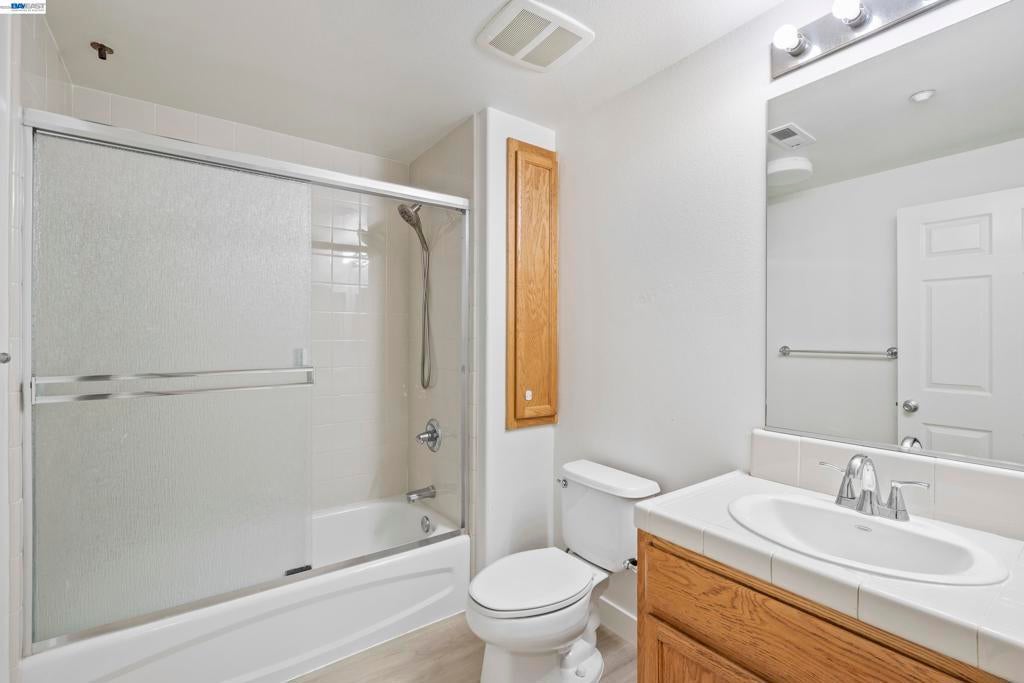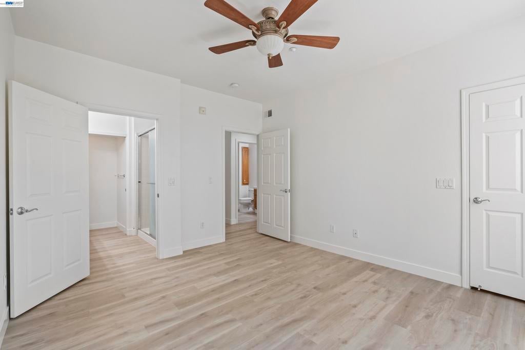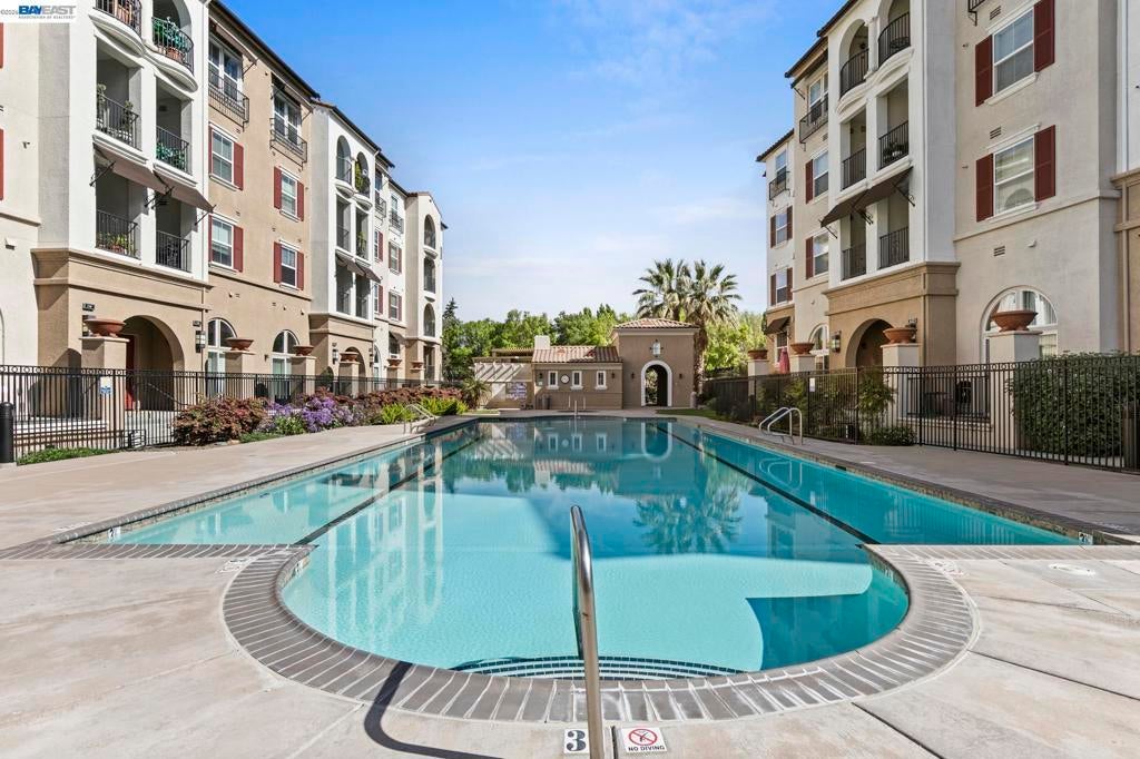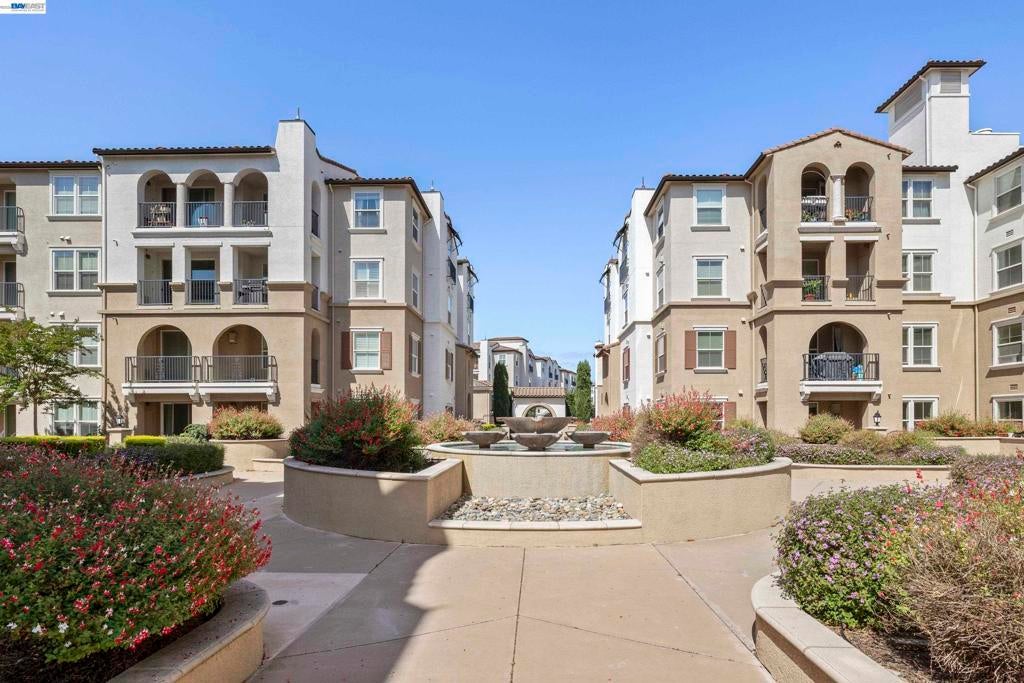 Desirable single level corner end-unit on the first floor offers a lifestyle of luxury and convenience. Large private patio perfect for entertaining and relaxation seamlessly transitions to the serene courtyard, creating a lovely indoor-outdoor living experience. 9-feet ceiling, natural light and open layout great room creates an airy and modern atmosphere. New paint and beautiful LVP flooring throughout the entire unit. Kitchen offers granite counters, maple cabinets, eat-in breakfast bar. Primary bedroom includes a walk-in closet and ensuite bathroom with a double vanity and walk-in shower. The third bedroom provides a versatile space for a home office, gym, creative studio, guest room or playroom. Central AC and heating system and ceiling fans. Washer/dryer in hallway closet. Resort style amenities include a clubhouse with gourmet kitchen, state-of-the-art gym and heated pool and spa. 24-hour secured gate entry. Assigned 2 side-by-side parking spaces in the secured underground parking lot with guest parking spaces and elevator access. Prime location near top rated schools, shopping, restaurants, golf, Kaiser, BART and 580/680. Walk to the new Emerald High School, Bray Commons Park with a fenced dog park, playground, basketball court.