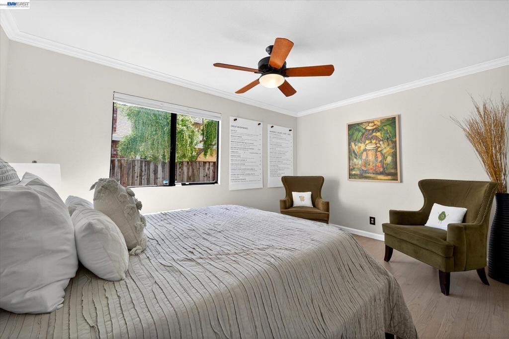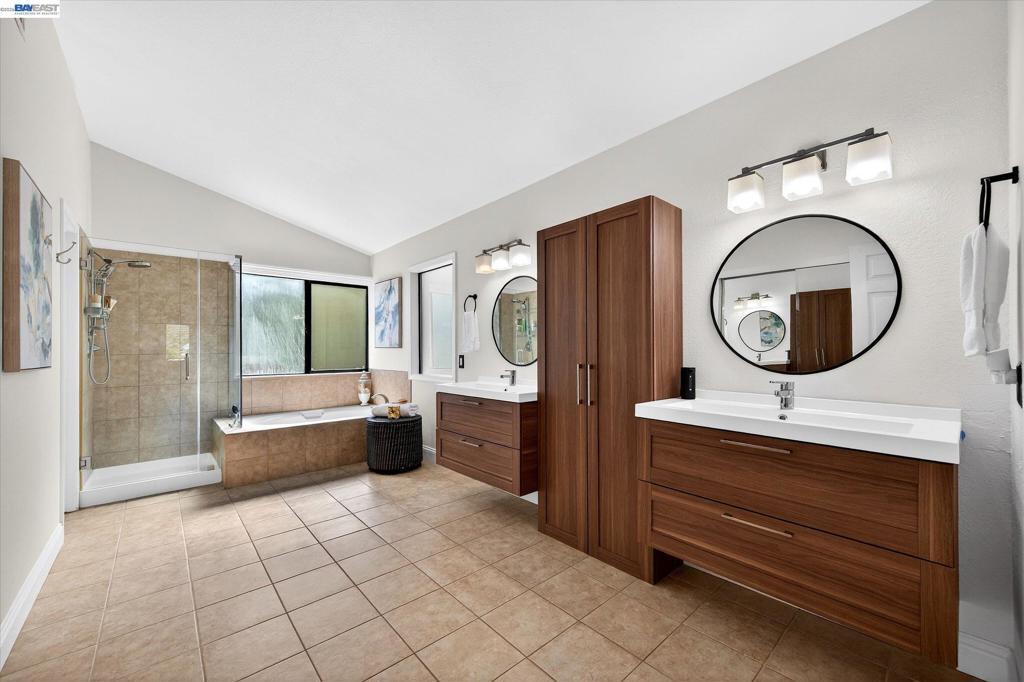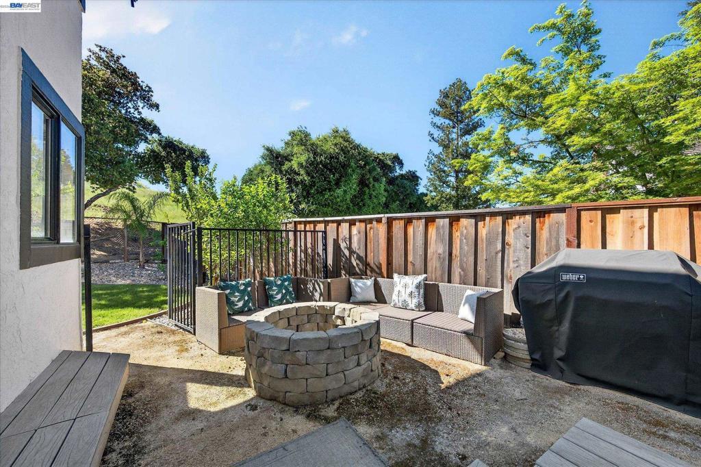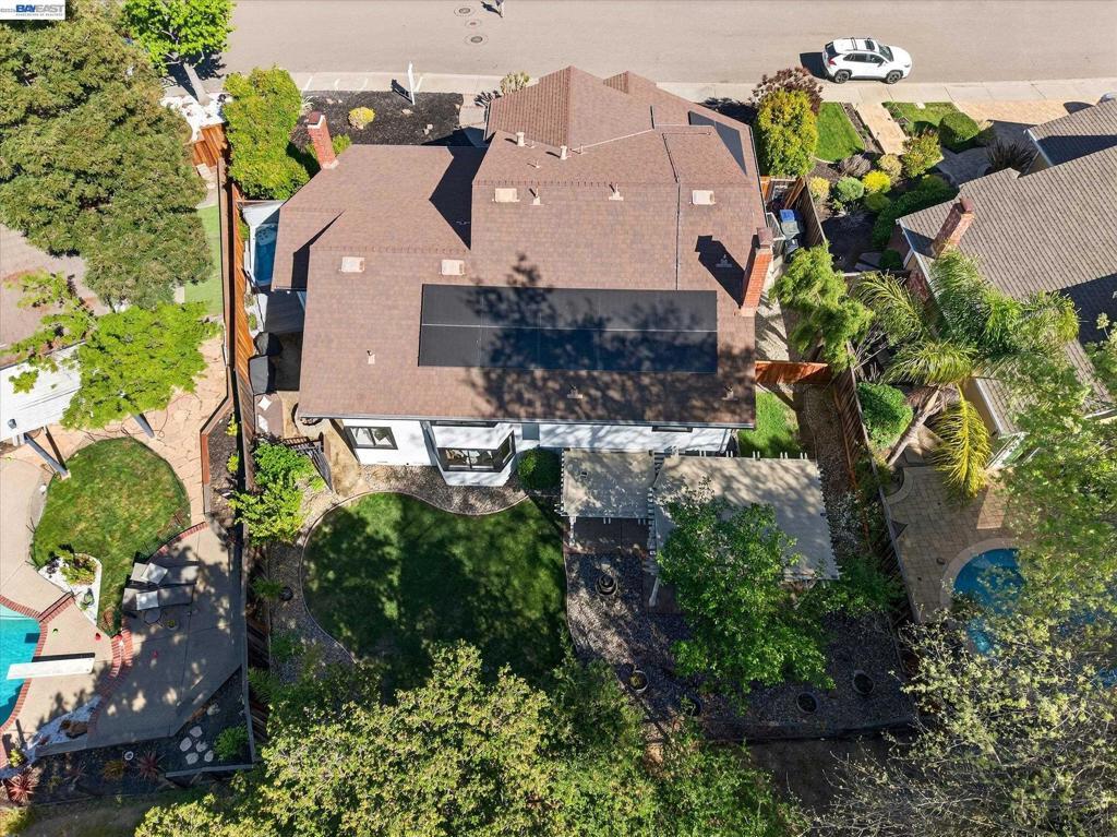 Located in the sought-after Vintage Hills II community, this spacious 5 bedroom, 3 bath home with owned solar offers comfortable living with vaulted ceilings, light-filled spaces, and a private backyard with protected hillside views. The living room features a tiled fireplace with wooden mantel and opens to the formal dining room with bright windows and French doors to the side yard with a fire pit and hot tub. The kitchen includes generous counter space, a center island with vegetable sink and breakfast bar, white cabinets with some glass doors, subway tile, and stainless steel appliances including a 5-burner gas range, double oven, microwave, refrigerator, and dishwasher. The kitchen opens to the family room with a stacked stone fireplace and sliding glass door to the backyard. A large main-level bedroom sits near a full bath with stall shower and a laundry room with garage access. Upstairs is the primary suite with sitting area, dual vanities, soaking tub, walk-in shower, and walk-in closet. Three additional bedrooms share a hall bath. The backyard offers lawn, covered patio, fire pit, and swim spa/plunge pool. Low HOA with community pool. Near parks, top Pleasanton schools, ACE Train and TECH buses. Open House Saturday/Sun 2-4pm.