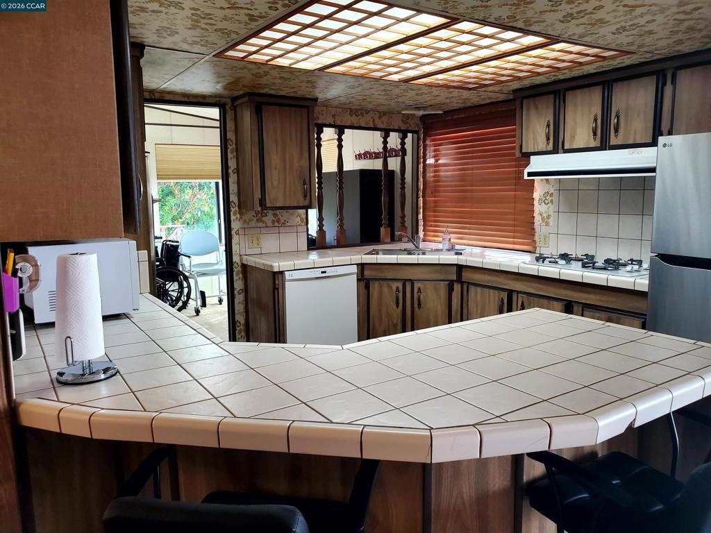 Motivated Seller! Welcome to this spacious doublewide mobile home located in the desirable Delta Hawaii Senior Mobile Home Park, a 55+ community. The primary bedroom features an en-suite bathroom with a large shower and enclosed closet. A second bedroom and full hall bath provide comfortable accommodations for guests or a home office. Also features a separate office space. Built in ramp & lift for wheelchair access . Refrigerator, washer, dryer are included. Enjoy the open and inviting living space, complete with a bright, light-filled kitchen and ample cabinetry. The kitchen flows seamlessly into the dining area and expansive living room—perfect for everyday living and entertaining. The living room is highlighted by a cozy raised hearth fireplace. This home offers a comfortable and functional floor plan with great natural light throughout. With a simple flooring update, you can easily make it your own! Relax on the west-facing front porch, ideal for enjoying sunny days. Additional features include tandem parking with a covered carport. Residents of this well-maintained 55+ community enjoy amenities such as a pool, organized activities, and landscaped green spaces. Conveniently located near shopping, freeway access, Los Medanos College, and local businesses. Fireplaces: FAM,ELC,HRT
