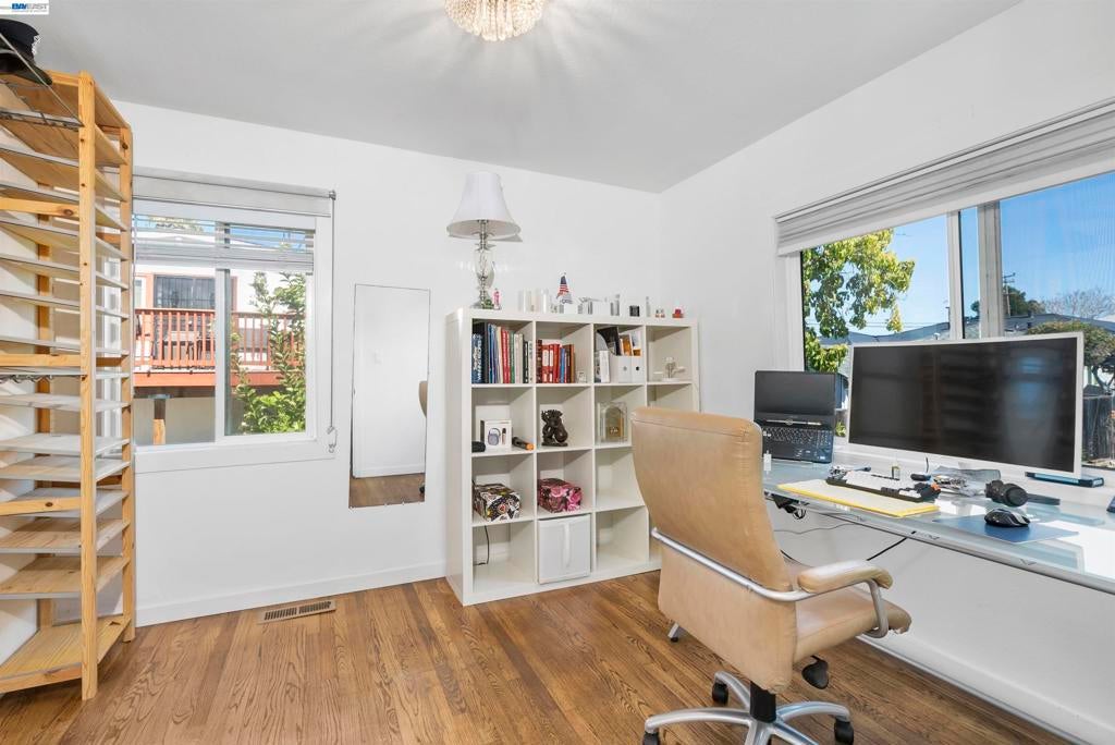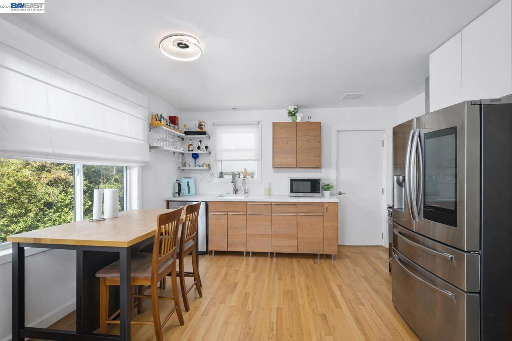 Some homes ask you to compromise. This one asks you to upgrade your lifestyle instead. Tucked into the Hayward Hills on a private, tree-lined 10,454 sq ft lot with bay views and mature fruit-bearing trees, this tri-level home gives every floor a purpose. Top floor: two bedrooms and a full bath, your private retreat. Main level: updated kitchen with stainless steel appliances, open living space, and hardwood floors. Lower level: home office, gym, guest suite, or the foundation for your ADU or JADU. The lot size and layout make multigenerational living or a future income unit genuinely possible. Premium upgrades include Tesla Solar, Tesla EV charger, tankless water heater, double-pane windows, stacked washer/dryer, and fire sprinkler system. Serene hillside landscaping and a peaceful, secluded setting complete the picture. Minutes from BART, Cal State East Bay, parks, trails, and commuter routes. This is intentional living in the East Bay hills, for the buyer who knows exactly what they want.