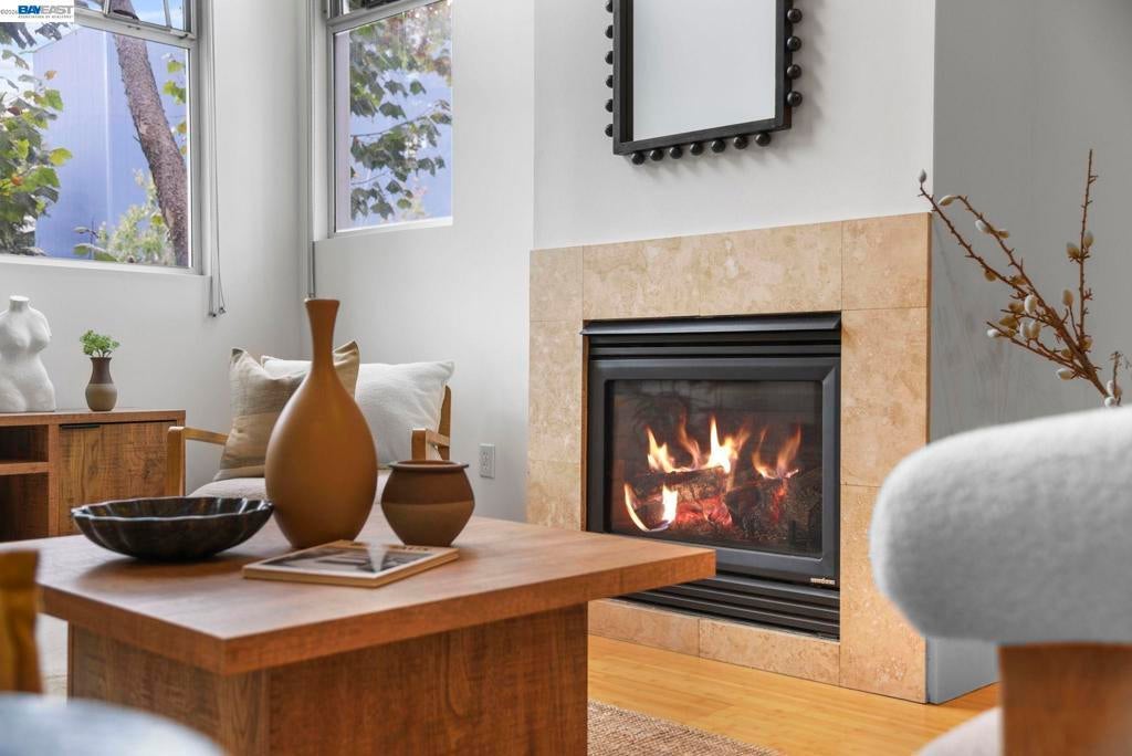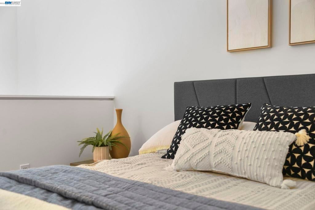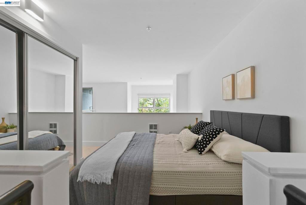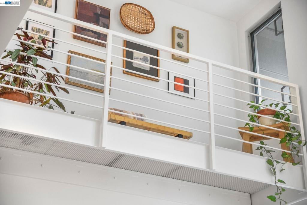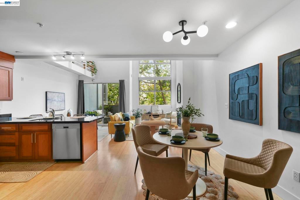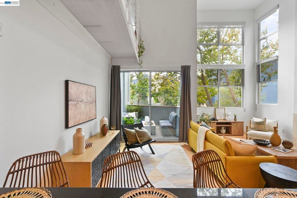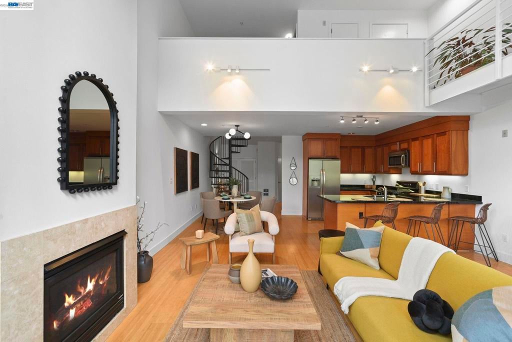 Why rent when you can have a place to call your own? Perched above street level in the centrally-located Key Route Lofts building, this second-floor loft condo offers scale, light, and livability. The vibe is more art gallery than apartment thanks to soaring vaulted ceilings, a wall of windows providing natural light, a gas fireplace, and an open floor plan that adapts to your lifestyle. The main level has bamboo flooring and the loft bedroom upstairs has new carpet. The 1-car garage parking, in-unit laundry, and sizable private balcony make this home a must-see. The kitchen offers newer stainless steel appliances and a sizable breakfast bar. The first floor offers flex space for a home office, your yoga mat or Peloton, or a reading nook. A spiral staircase connects both levels—upstairs, the bedroom loft includes a catwalk mezzanine perfect for storage or showcasing plants, art, or your next fashion show. An ensuite bath with shower over tub completes this level. This is that rare find: serene and tranquil inside, while dining, shopping, and transit options sit just outside your door. Bay Street, Target, Home Depot, MacArthur BART, I-580, 880, Highway 24, the Bay, and Aquatic Park are all minutes away.