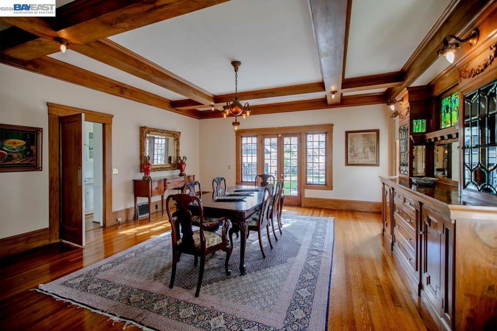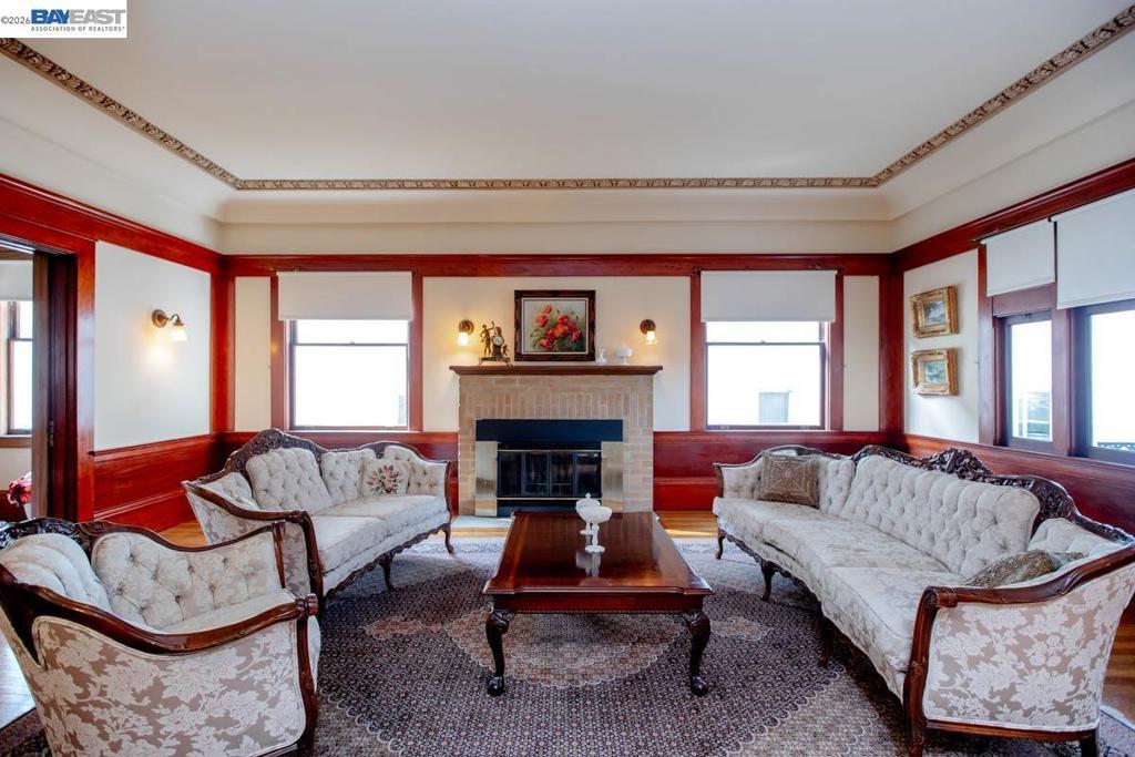 Built by the respected Alameda designer/builder William Dufour in 1912, this spectacular Colonial Revival home combines an impressive exterior with a spacious interior filled with stunning vintage architectural features. Situated on a large .27-acre lot, the home maintains the original versatile floor plan featuring 5BR, 1+ BA, formal living and dining rooms, a large kitchen and butler's pantry, a main floor family room and a home office (possible 5th and 6th bedrooms). Beautifully preserved original details include 10-ft tray ceilings w/ornate moldings, hardwood floors, gorgeous built-in sideboards accented w/leaded and stained glass (2), oversized windows, a coffered DR ceiling, and large rooms throughout the home w/beautifully crafted wood trim and bright, natural light. A high-ceilinged attic and a basement both provide potential for additional finished square footage expansion/conversion (1,041 SF and 1,660 SF, respectively). A private lot of this size is unusual in central Alameda, and includes a detached 2-car garage, a patio, a wisteria-covered pergola and mature landscaping. Perfect for gracious entertaining, or simply appreciating the home's many beautiful features and important architectural heritage, this home represents a rare Alameda home ownership opportunity.