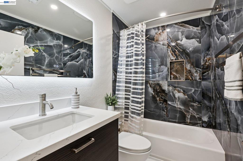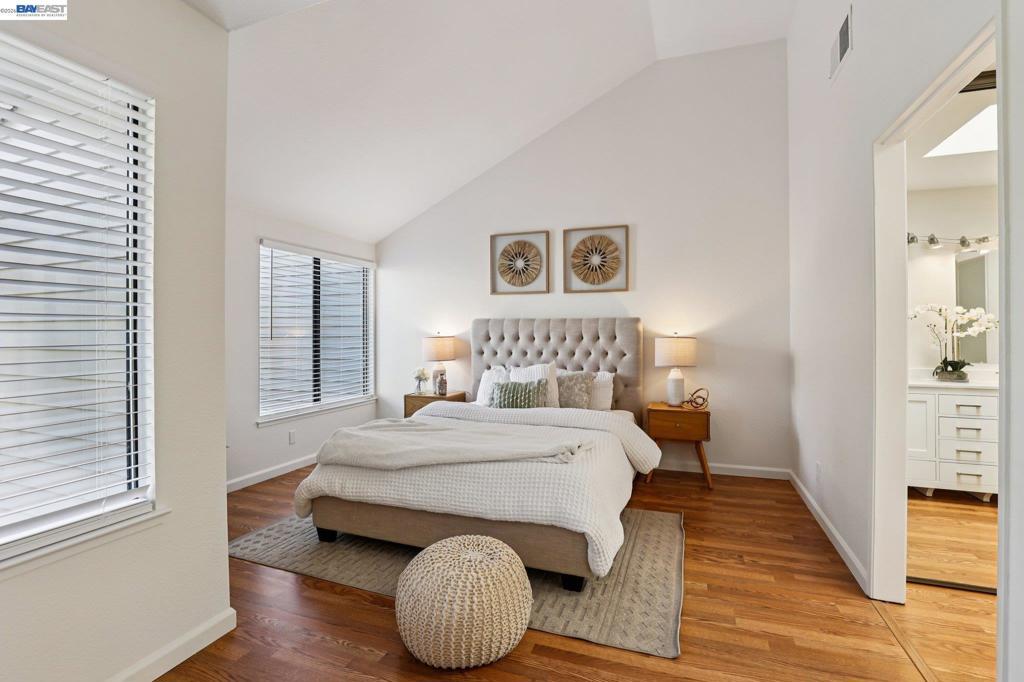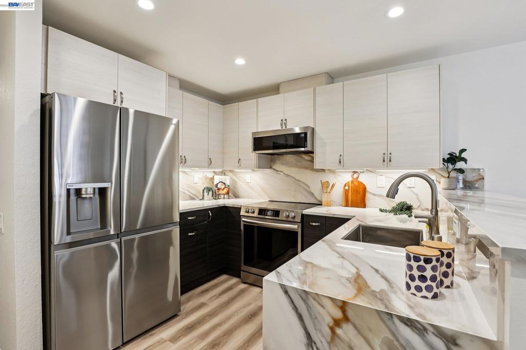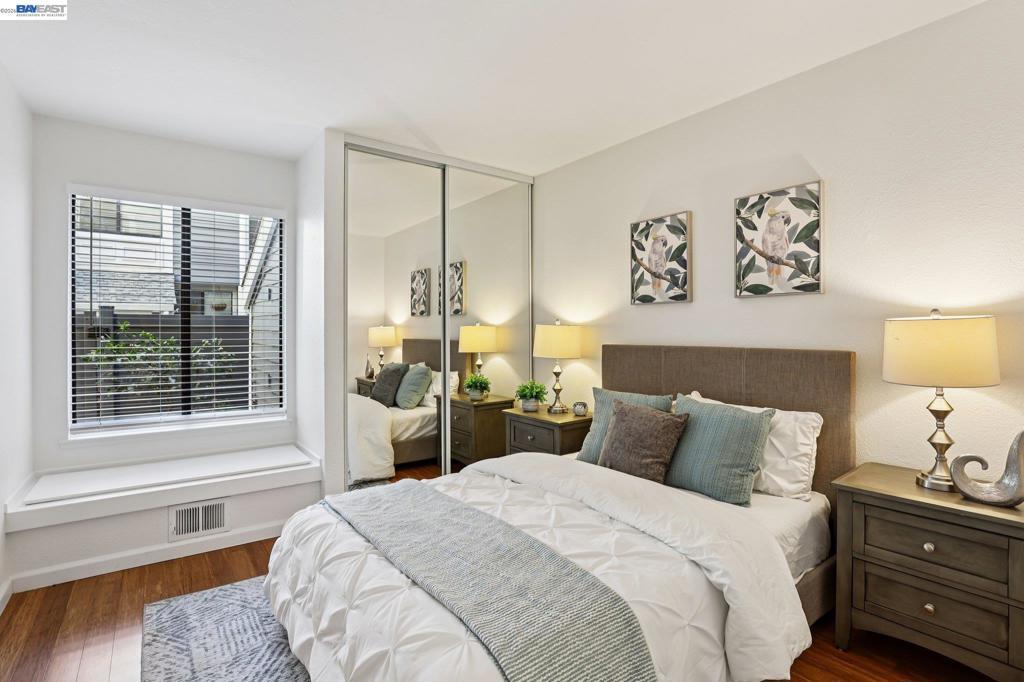 Beautiful EAST-FACING home in a highly desirable Pleasanton location with privacy, abundant NATURAL LIGHT, and a flexible layout featuring a DOWNSTAIRS BEDROOM. This TOWNHOUSE-STYLE CONDO is WALKABLE to TOP-RATED SCHOOLS and offers ~1,690 sq ft with NEW CARPET and FRESH PAINT throughout. The spacious LIVING ROOM features VAULTED CEILINGS, a woodburning fireplace, and sliding glass doors to a PRIVATE PATIO. The kitchen showcases a flowing SEMI-ISLAND with Calacatta Macchia Vecchia Italian PORCELAIN countertops, ALL-NEW APPLIANCES, ample cabinetry, and a modern backsplash. The PRIMARY SUITE offers vaulted ceilings, a sitting area, and a REMODELED EN-SUITE, while the secondary bedroom includes vaulted ceilings, mirrored closets, and access to an REMODELED bath. EXTENSIVE UPGRADES include a completely REMODELED KITCHEN and dining area with new electrics and water lines, remodeled primary BA with dual-sink vanity, NEW HVAC, NEW WATER HEATER, NEW DOORS and sliding glass door, electrical circuits updated, basement sealed, NEW WASHER & DRYER, TILE FLOORING in entry, and ample storage. Additional highlights: private patio with mature lemon tree and storage shed, DETACHED 1-CAR GARAGE & 1 CARPORT, move-in ready, minutes from downtown, parks, shopping, and award-winning schools.
