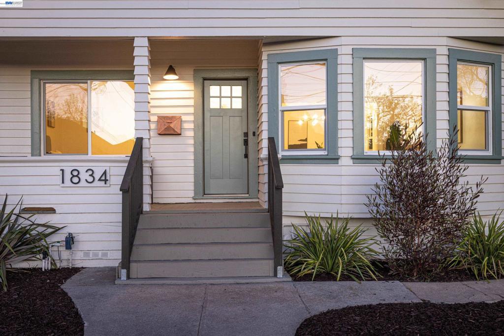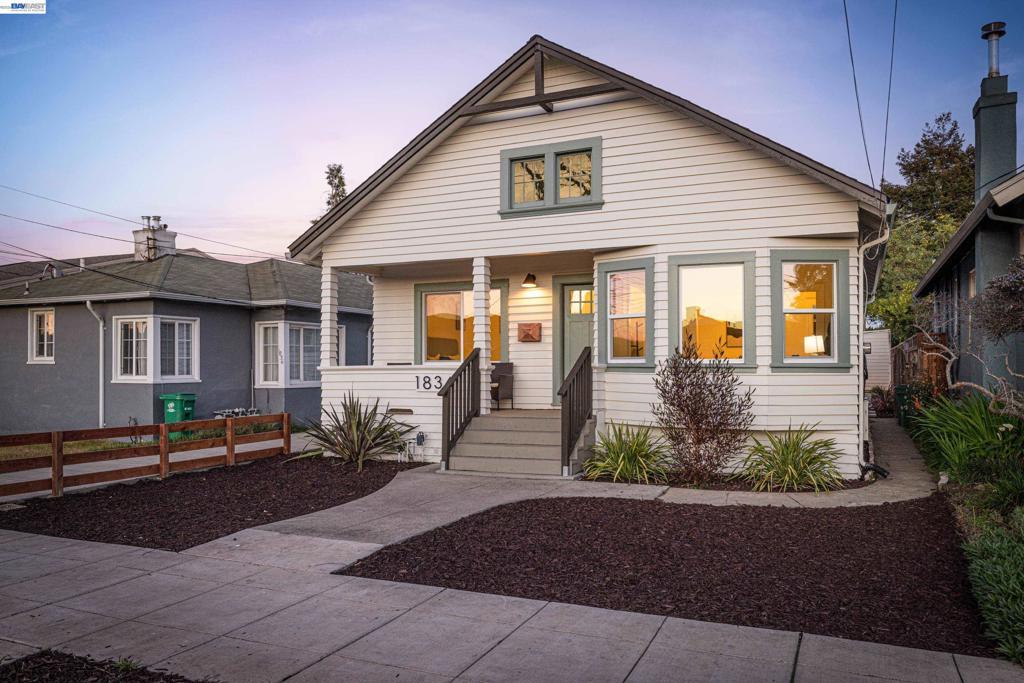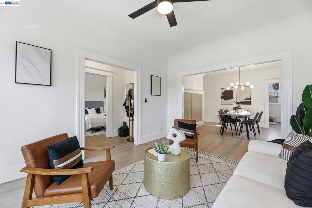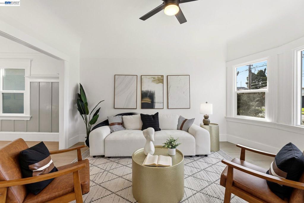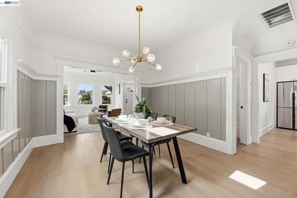 Move right in! Recent upgrades include a newer roof, dual-pane windows, HVAC with air conditioning, EV charger, updated flooring, and a fully renovated kitchen and bathrooms. Located in Alameda’s West End, this charming 1905 Craftsman bungalow offers 2 bedrooms, 2 bathrooms, and 979 sq ft of updated living space on a 4,305 sq ft lot. Luxury plank flooring runs throughout. The living room features bay windows and a modern ceiling fan, while the dining room showcases high wainscoting with picture rail and a contemporary brass starburst chandelier. The kitchen showcases white shaker-style upper cabinets, gray lower cabinets, quartz countertops, stainless steel appliances, recessed lighting, and an island with a fluted wood accent panel. The primary bedroom includes an ensuite bath with herringbone tile floors and a tiled stall shower with glass enclosure. The second bathroom features a tiled shower over tub. The landscaped backyard includes a detached structure with French doors and recessed lighting—ideal for an office, studio, or gym. Located near Jean Sweeney Open Space Park, Webster Street shops and dining, and easy Webster/Posey Tube access. Open house Sat 3/28 & Sun 3/29 2-4pm.