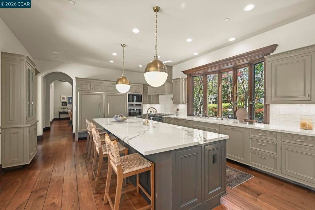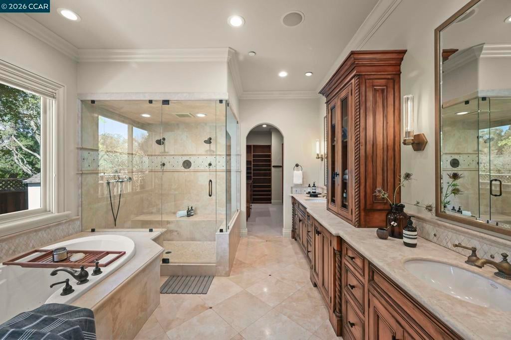 Phenomenal Diablo (mostly) SINGLE STORY Estate on a highly desired street, close to the club! Timeless architecture and tremendous quality and finishes throughout. There are only two upstairs flex rooms, one a bar with deck overlooking the back yard, the other has a private entrance ready to become an apartment. Huge cooks kitchen, 800 bottle wine closet, wide plank Walnut floors and lovely, magnificent molding and beams throughout are just a few of the highlights. The primary suite is stunning, featuring a spa-like bathroom and an enormous walk-in closet. Two large auxiliary bedroom suites, an executive office, a private guest room, a stunning dining room, a gracious living room, wonderful kitchen and family room are on 1st floor. If you are drawn by the yard, look no further. The RESORT style backyard includes a pool, spa, covered loggia, outdoor kitchen, fireplace, sport court, putting green & garden. The property has a gated circular driveway, a 3 car attached & 2 car detached garage w/heat, air currently used as a home gym with a full bath. The garages are off Palma Vista where there is extra parking. Open Sunday 4-19 from 1-4pm.
