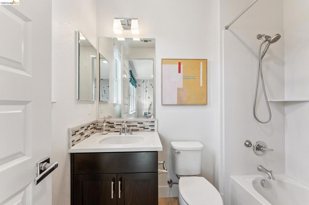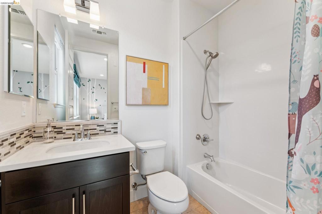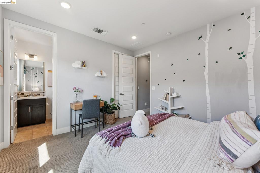 Stylish 3-Level Condo with Modern Finishes | 3BD / 3.5BA | Alameda Built in 2016, this well-maintained 3-bedroom, 3.5-bathroom condo offers approximately 1,784 sq ft of thoughtfully designed living space across three levels. The main living area features an open-concept kitchen, dining, and living room layout with access to a private balcony off the kitchen. The kitchen includes a large center island with breakfast bar seating, granite countertops, built-in cabinetry, and a spacious walk-in pantry, providing ample storage and functionality. Flooring throughout the home includes a combination of tile, hardwood, and carpeted bedrooms. All bedrooms offer comfortable separation across levels, and the home includes 3 full bathrooms plus a powder room off the kitchen for guests. Laundry is conveniently located on the third floor. Additional features include two-zone air conditioning, Nest thermostat system, and abundant thoughtful storage throughout. The property includes a 2-car attached garage and is located adjacent to a green community space. Guest parking is available along Diller Street. Convenient Alameda location with access to local amenities, shopping, and commuter routes.