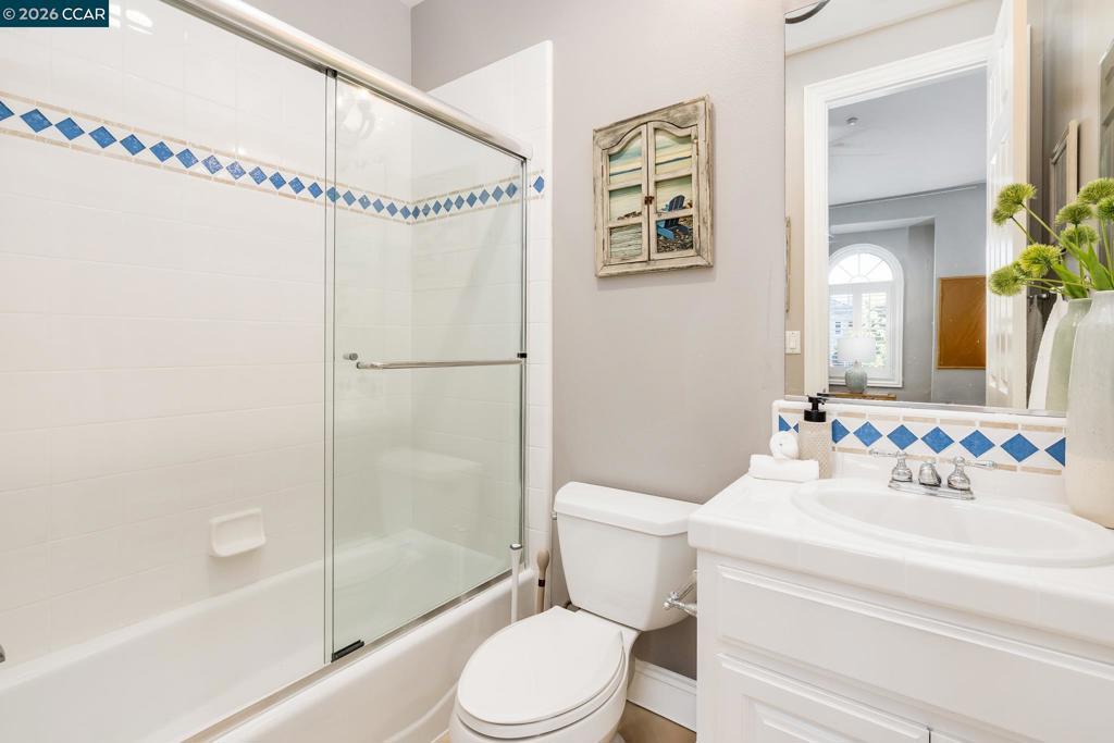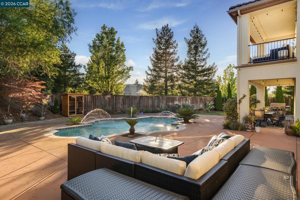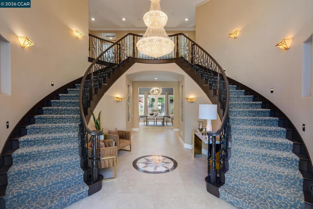 Nestled within the prestigious gated community of Norris Canyon Estates, this stunning home offers luxury living at its finest. Spanning almost 5,000 square feet, this exceptional residence features 5 bedrooms & 5.5 baths on an expansive, level .41-acre lot. An impressive grand entry welcomes you with a dramatic dual staircase & soaring ceilings. This floor plan includes formal living & dining rooms, a private office/library with custom built-ins, a sought-after main-level ensuite bedroom & seamless indoor-outdoor flow through French doors. At the heart of the home, the remodeled kitchen showcases a center island, premium Thermador SS appliances, custom cabinetry & opens to the family room, creating the perfect hub for everyday living & entertaining. The luxurious primary suite offers a fireplace, sitting area, private balcony & spa-inspired bath. All secondary bedrooms are generously sized & feature ensuite baths, providing comfort & privacy. Step outside to your own resort-style backyard retreat, featuring a solar & gas-heated pool/spa, expansive patios including covered outdoor living area, sport court & beautifully landscaped grounds with room to relax & play. Located in one of San Ramon’s most exclusive communities, just minutes from top-rated SRV schools, shopping & dining.